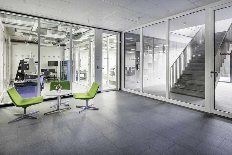 Im Gebäude treffen beide Eingänge auf die mittlere aufgeweitete Flurzone, die durch den eingestellten Aufzug zoniert wird und so ebenfalls als Kommunikationszone für Kurzbesprechungen genutzt werden kann. Direkt bei den Eingängen sind die Messräume durch vollverglaste Trennwände optimal einsichtig, sodass Besucherinnen und Besucher gleich beim Betreten einen Einblick in das Herzstück des Gebäudes erhalten. Von der mittleren Flurzone werden weiterhin der große Konferenzraum und die Mitarbeiterkantine im Südosten, sowie ein mittlerer Besprechungsraum und ein "Stillarbeitsraum" auf der Nordwestseite erschlossen. Hier belichten teilverglaste Trennwände die Flurzone optimal mit Tageslicht, was gleichzeitig der Orientierung dient. Eine Haupttreppe aus Sichtbeton – zentral zwischen den Zugängen - führt ins Obergeschoss zu den Büroräumen. Zusätzlich gibt es aus brandschutztechnischen Gründen noch eine weitere Nebentreppe, ebenfalls aus Sichtbeton.