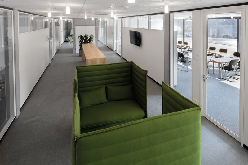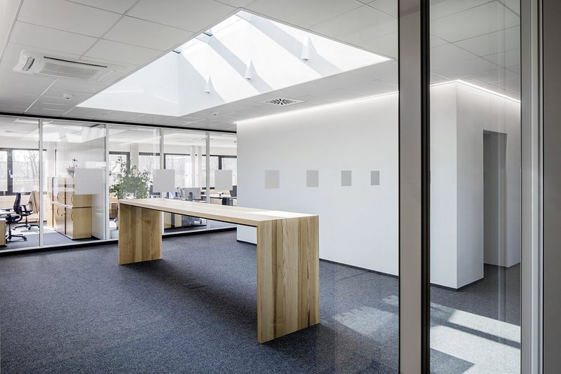 Im Obergeschoss gibt es ebenfalls die aufgeweitete Flurzone, die hier durch eingebaute Inseln wie Teeküche, Garderobe und Besprechungsraum noch stärker zoniert wird als im Erdgeschoss. Hell belichtete, lange Stehtische unter dementsprechend quer ausgerichteten Oberlichtbändern im Flachdach laden zur Kommunikation bzw. Kurzbesprechung unter Kollegen ein. Die Bürotrennwände sind ebenfalls voll verglast und ermöglichen viele Blickbezüge.