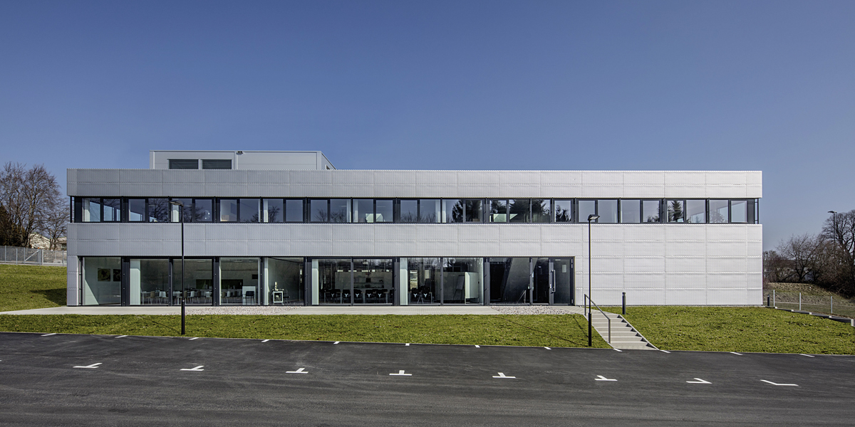 Das Gebäude ist ein Stahlbetonbau mit Stützen in Sichtbetonqualität. Vorgehängte Porenbetonplatten bilden zusammen mit Dämmung und Abdichtung die Außenhaut. Als Fassade dient ein Streckmetallgitter aus eloxiertem Aluminium, das je nach Sonneneinstrahlung mal weiß erscheint oder silbrig glänzend. Im Innenraum wurden Materialien sehr reduziert eingesetzt: Im Erdgeschoss dominieren neben dem Sichtbeton der Treppenhäuser und der Treppe ein Granitbodenbelag sowie die Glastrennwände mit weißen Teilflächen und einige Edelstahlflächen beim Aufzug und am Treppengeländer. Im Obergeschoss kommt zusätzlich ein Nadelfilzteppichbelag zu den gleichen Materialien wie im Erdgeschoss dazu. Die Decken in den Büro- und Besprechungsräumen und in der Flurzone sind abgehängt. In den Messräumen ist die Technik unter der Ortbetondecke sichtbar angeordnet. Auf der Südostseite ist eine ebenerdige Außenterrasse dem Konferenzraum und der Kantine vorgelagert, die im Sommer eine Außenbestuhlung ermöglicht.