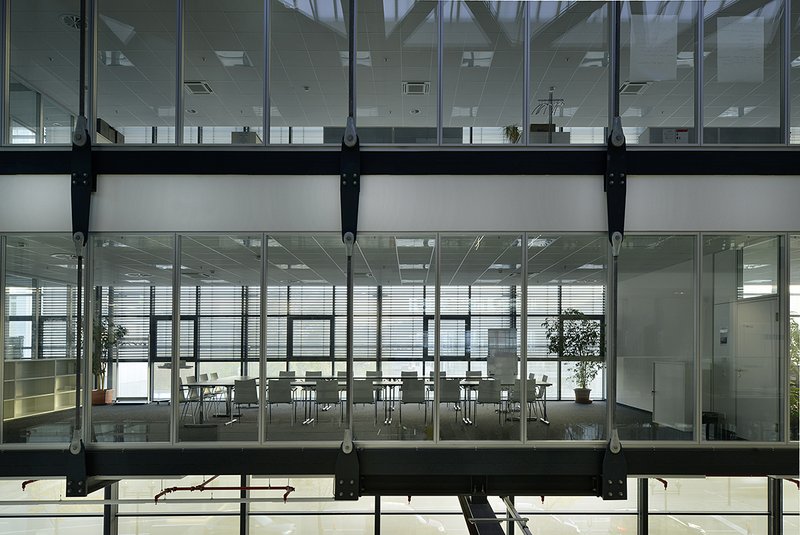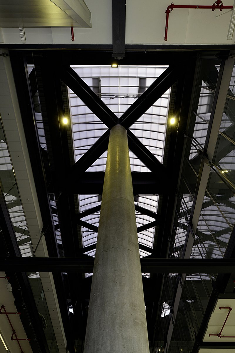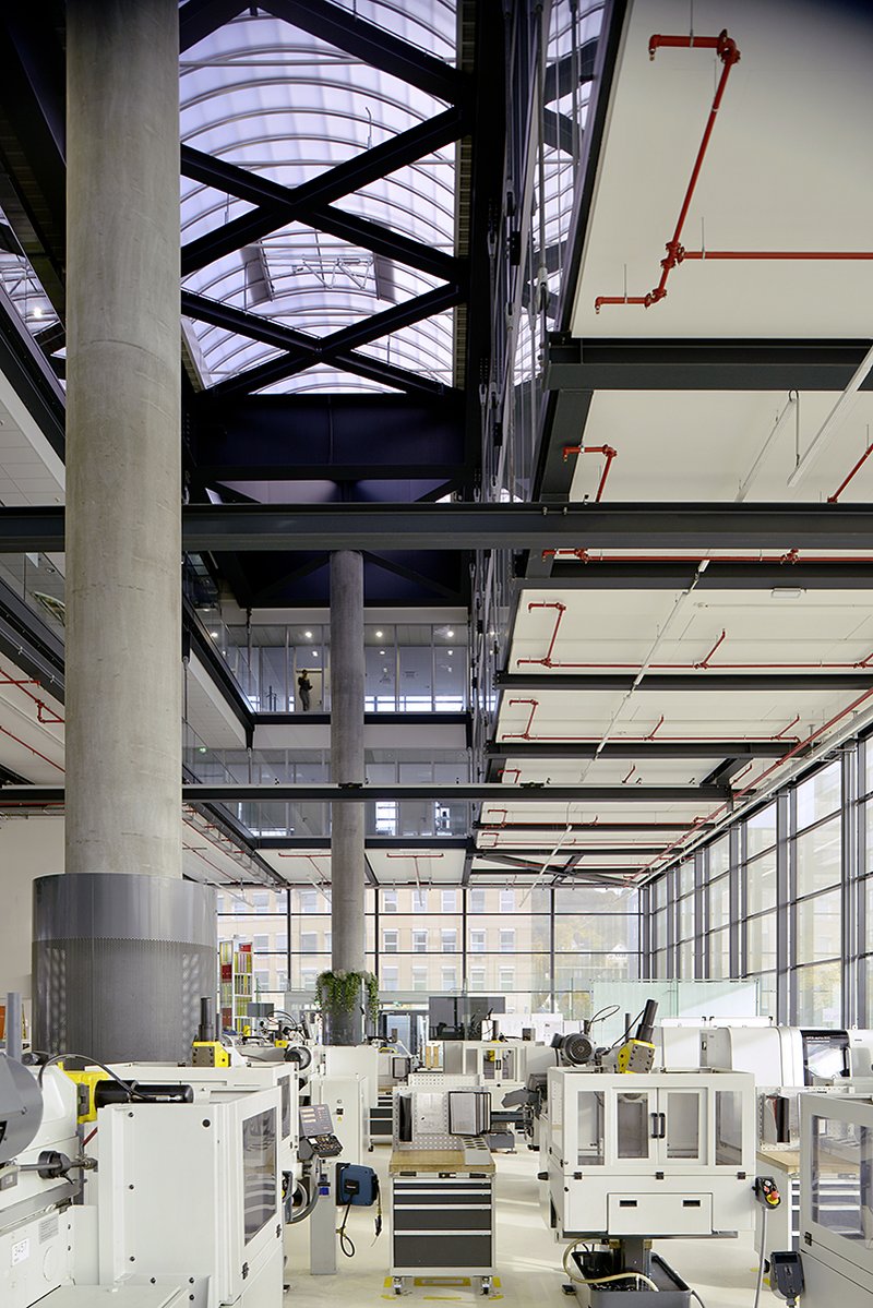TragwerkUm größtmögliche Flexibilität zu gewährleisten, wurde über einer durchgehenden Bodenplatte mit vier eingespannten Stützen ein gestapelter Dachrost aufgehängt, an dem wiederum über Zug- und Druckstäbe die gläserne Außenhaut befestigt ist. Dieses statische Konzept erfüllt vielfältige Anforderungen. Zunächst ist ein nahezu stützenloser und damit höchst flexibel nutzbarer Raum möglich, der wechselnden Nutzungsanforderungen jederzeit gerecht werden kann. Das Konzept eines über Zug- und Druckstäbe an vier Stützen aufgehängten Trägerrostes ermöglicht es, aufgrund von Vorspannung mit sehr hohen Anhängelasten am Dach arbeiten zu können – ähnlich einer Brückenkonstruktion. Die Zug- und Druckstäbe dienen ihrerseits wiederum als Fassadenunterkonstruktion, sodass dies automatisch zu einer Kostenoptimierung der Außenhaut führt. Die Montage des Rostes war auf der Bodenplatte vorgesehen, womit Einrüstungen für den Aufbau der Dachkonstruktion überflüssig waren. Nach kompletter Montage des Trägerrostes erfolgte ein hydraulischer Teilhub, sodass über Kopf sämtliche Montagen, die am Dach notwendig waren, ohne Gerüste erfolgen konnten.Abschließend wurde der Trägerrost auf seine endgültige Position angehoben, über die bereits erwähnten Zug- und Druckstäbe an der Bodenplatte befestigt und durch einen sogenannten Nachhub überhöht, um die gewünschte Vorspannung zu erhalten. Diese Überhöhung/Vorspannung stellt die gewünschten hohen Anhängelasten am Dachrost sicher. Die vier Stützen werden zudem für die Technische Gebäudeausrüstung genutzt: Unter anderem die lufttechnische Ver- und Entsorgung wird über diese Stützen geführt. Das Konstruktionsprinzip wird somit zur Gestaltungsform: Das Tragwerk vereint Konstruktion, Gebäudetechnik, Gestaltung/Architektursprache und ergibt, nicht zuletzt aufgrund von wirtschaftlichen und bauzeitlichen Vorteilen, ein innovatives und kreatives Gesamtkonzept.
