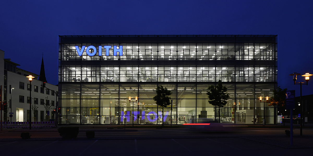 ArchitekturFür das neue Ausbildungszentrum der Firma Voith, in dem Berufsausbildung und Personalentwicklung untergebracht sind, wurde ein kompaktes, multifunktionales und transparentes Bauwerk konzipiert. Unter einer gläsernen Hülle, die von lediglich vier Stützen getragen wird, befindet sich „Alles unter einem Dach“. Das vielfältige Raumprogramm mit seinen unterschiedlichen Arbeitsbereichen wird dadurch in größtmöglicher Flexibilität realisierbar. Werkstätten im Erdgeschoss können unbeeinträchtigt von der Baukonstruktion optimal frei und flexibel im Raum angeordnet werden. Bauphysikalische Anforderungen werden durch konzentrierte Maßnahmen, wie z. B. Kapselung, separate Luftbehandlung etc. wirtschaftlich gelöst. Der über eine Nebenraumspange abgetrennte Kantinenbereich orientiert sich über großzügig angelegte Freiflächen mit Baumdach zur Brenz hin und bietet multifunktionale Nutzungsmöglichkeiten in jeder Hinsicht (z. B. für Veranstaltungen, Präsentationen etc.). Mit dieser Platzlösung wird gleichzeitig der Empfang zur St. Pöltener Straße hin gefasst. Schulungs- und Bürobereiche wurden in einer zweigeschossigen, ringförmigen Anordnung in den großen Luftraum direkt an der Dachkonstruktion abgehängt. Neben der flexiblen Unterteilbarkeit dieser Flächen ist ein stets vorhandener Einblick in sämtliche Werkstatt- und Ausbildungsbereiche im gesamten Gebäude gesichert, womit allen Auszubildenden und Schulungsteilnehmern das gesamte Ausbildungsspektrum vor Augen geführt wird, was zum Verständnis der Unternehmensphilosophie und zur Identifizierung mit dem Unternehmen beiträgt. Gleichzeitig wird über die Transparenz ein Schaufenstercharakter erzielt, der jederzeit Einblick und Information gewährt. Nicht zuletzt soll das architektonische und baukonstruktive Konzept die Innovationskraft und Kreativität des Unternehmens kommunizieren.