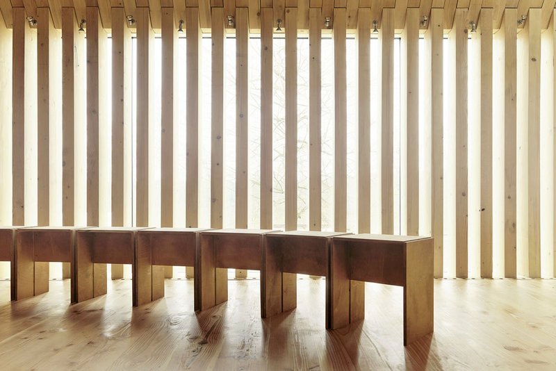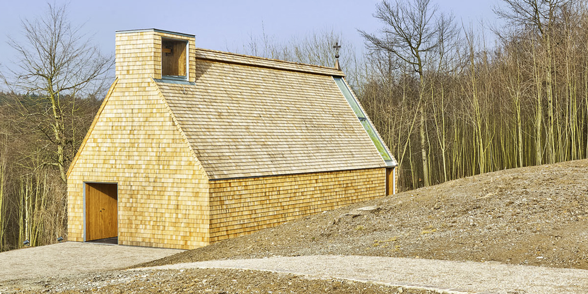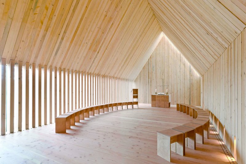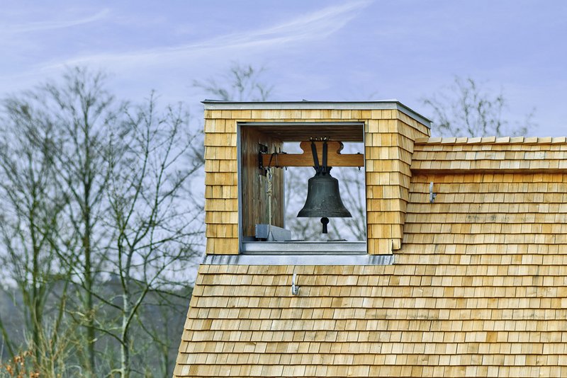 Baustoff LichtDas Gebäude selbst ist in seiner äußeren Gestalt bewusst dem Archetypus Haus verpflichtet und die Integration der historischen Glocke in einem Dachreiter bringt unmissverständlich zum Ausdruck, dass es sich bei dem Haus um eine Kirche handelt.Der Innenraum entspricht in seinen Umrissen der äußeren Gestalt. Auf das Wesentliche reduziert, erhält der Raum seine sakrale Atmosphäre durch die subtile Modulation des Tageslichts.Gefiltert durch den Querschnitt der Holzrahmenkonstruktion bekommt der Innenraum über die Fassade gleichmäßiges Nordlicht, während die östliche Giebelwand, vor der bei Gottesdiensten der Altar steht, durch Streiflicht in Szene gesetzt wird. Das Tageslicht wird somit zum wichtigsten Element der Raumgestaltung. Es erweckt das Holz zum Leben, welches als Baumaterial fast ausschließlich zur Verwendung kam.