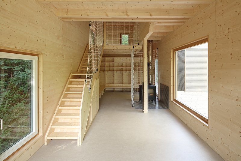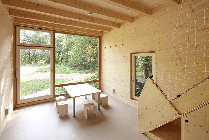 Treffpunkt Unterstand Der Unterstand wird über eine Garderobe für Schuhe, Jacken, Überhosen und Rucksäcke betreten.Ein Stückholzofen ermöglicht das Aufwärmen und Trocknen der Kleider. Die großen Fenster liefern Tageslicht. Innen empfängt die Kinder ein Ambiente gestaltet aus heimischer Fichte. Der erkletterbare Dachboden dient als Beobachtungsposten für die Pflanzen und Tiere des Waldes, für Eichen und Eichhörnchen.
