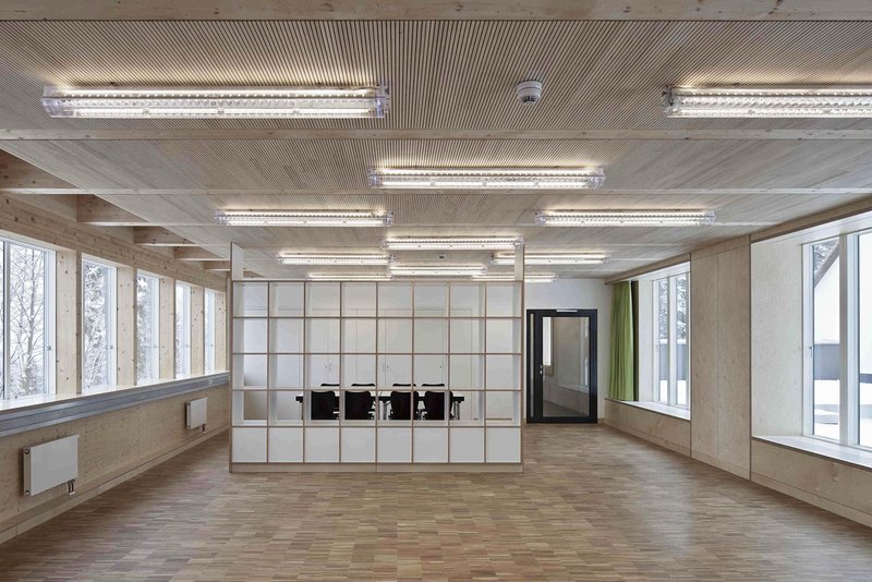 Der Neubau des Waldschulheims ist ein dreigeschossiger Holzbau auf einem massiven Sockelgeschoss. In diesem Sockelgeschoss befinden sich Technik- und Werkstatträume. Darüber dann die Schlaf- und Aufenthaltsräume. Küche und Speisesaal sind im Bestand bzw. im Verbindungsbau untergebracht. Hauptbaumaterial für Konstruktion und Ausbau sind heimische Hölzer, die von regionalen Handwerkern verarbeitet wurden.