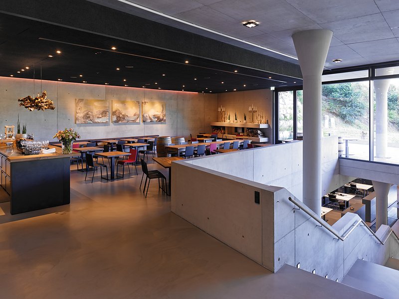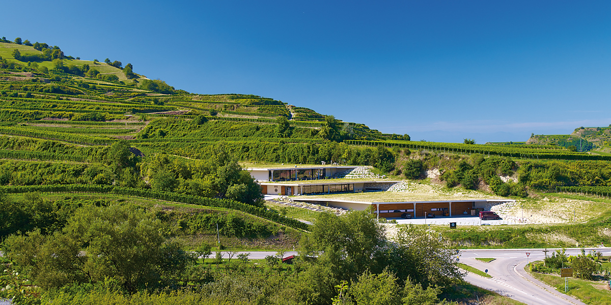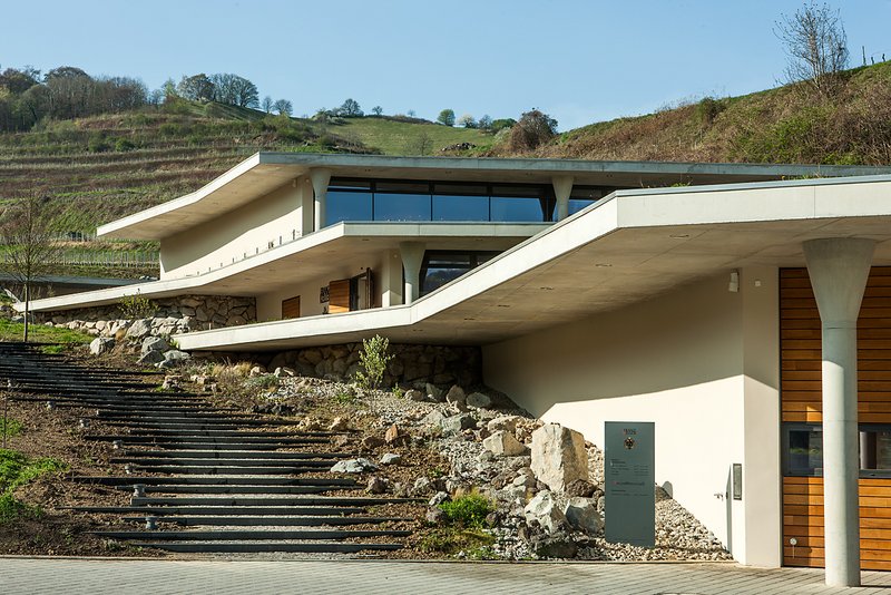 Die Verschmelzung von Gebäude und Natur bei optimaler Nutzung der Gravitation für die Weinbereitung waren die entscheidenden Grundlagen des Entwurfs zum Neubau des Weingutes Franz Keller in Oberbergen.Im Einklang mit den Terrassen des Kaiserstuhls verbindet sich das Gebäude mit der Landschaft. Mit dem Konzept der drei Ebenen, welche gegeneinander versetzt sind, scheint das Gebäude mit der Umgebung zu verschmelzen und greift so gleichzeitig die für den Kaiserstuhl typische und prägende Terrassenlandschaft auf. Der harmonische Übergang von Natur und Gebäude besticht durch seine Selbstverständlichkeit. Sämtliche Dachflächen sind mit einem Wiesensaatgut vom benachbarten Badberg begrünt, welches eigens aus dem Naturschutzgebiet gewonnen wurde. So eingepasst in die einzigartige Kulturlandschaft bietet das Weingut gleichzeitig interessante Einblicke in die Produktionsabläufe und einen einzigartigen Panoramablick von der Terrasse des Weingutrestaurants "Kellerwirtschaft" - Kaiserstuhl zum Anfassen.