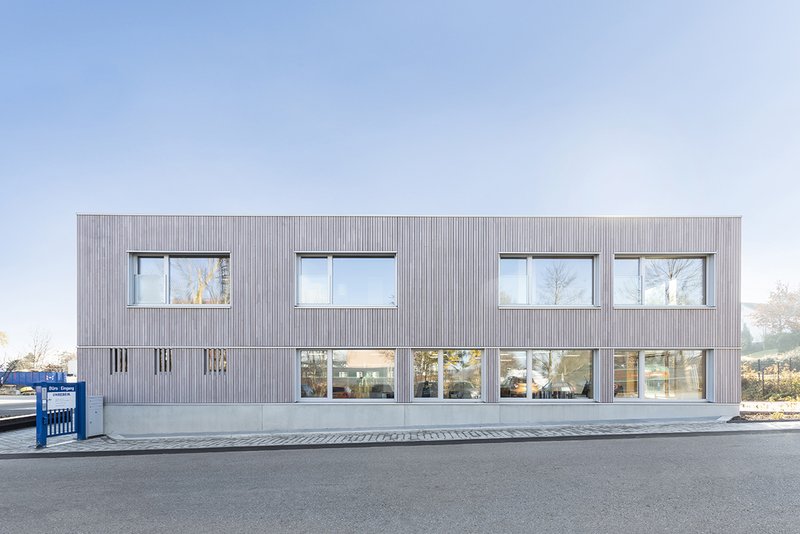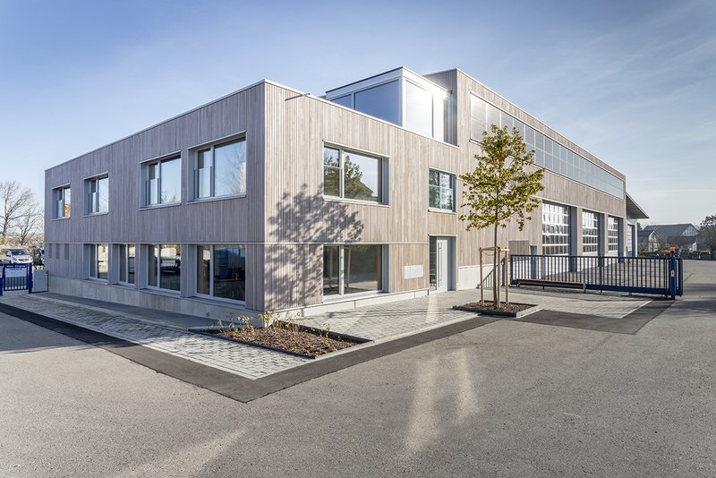 Die Fassade der Halle sowie des Bürogebäudes wurde komplett als Holzfassade projektiert, die Photovoltaik-Anlage ist darin integriert und zeigt deutlich den Anspruch der Bauherren auch im Industriebau nachhaltig für zukünftige Generationen zu bauen. Durch die aufwendige Abstimmung der Fensterformate, Neugestaltung der Eingänge und der Zugangssituationen entsteht ein ruhiger Gesamteindruck.