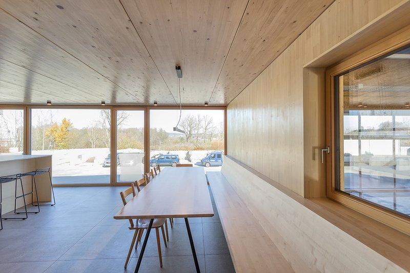 In der Werkhalle wurde in Containerbauweise in Massivbauweise ein Bereich für die Mitarbeiter vorgesehen. Hier befinden sich die modernen schwarz-weißen Umkleiden für Damen und Herren. Im Obergeschoss gibt es einen Gemeinschaftsraum mit Küche und großer Eckbank für die Mitarbeitenden, der mit seiner großzügigen Glasfassade den Blick in die Umgebung ermöglicht. Dies schafft eine spannende Atmosphäre im eigentlichen Werkhallenbereich. Hier sind die Oberflächen ebenso hochwertig und meist in Sichtqualität ausgeführt – ein klares Zeichen des Arbeitgebers für eine gute Arbeitsumgebung.