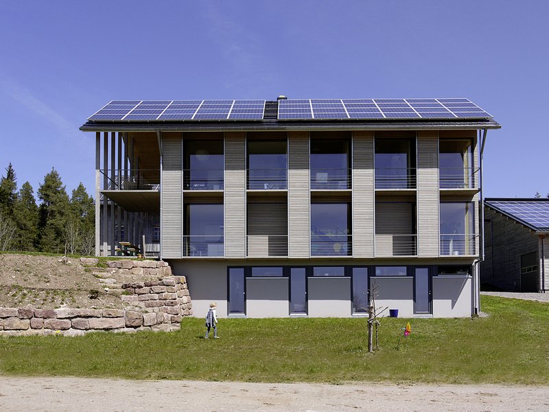 Durch die Längsausrichtung des Gebäudes nach Süden und der vollflächigen Verglasung wird die im Winter tiefstehende Sonne optimal ausgenutzt. Im Sommer dienen der Dachüberstand und die Balkonstege im Erd- und Obergeschoss als Sonnenschutz.