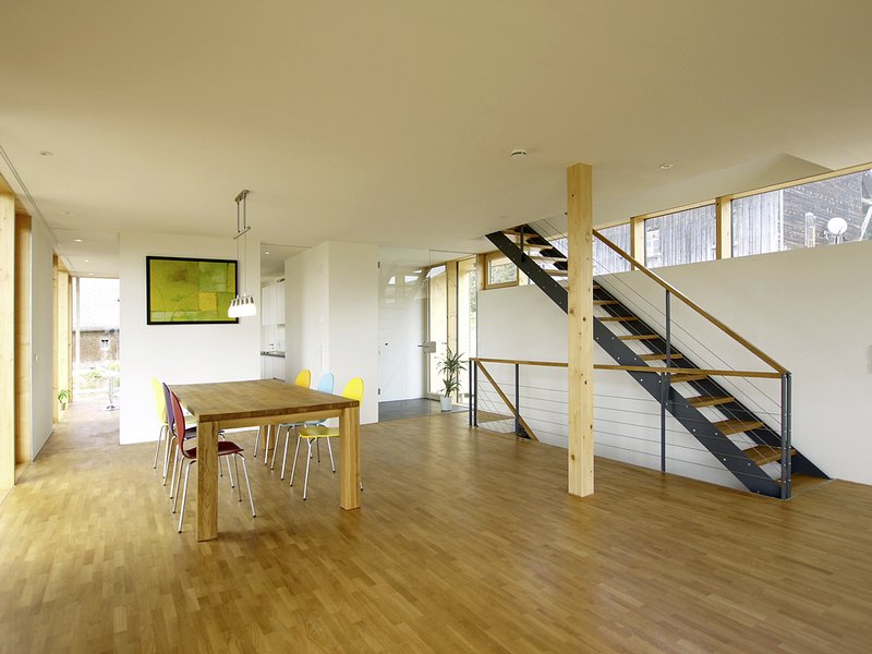Der gesamte Baukörper ist ein Holzständerbau. Die Wände sind als Elemente vorgefertigt an die Baustelle geliefert worden. Sie sind innen mit Gipsfaserplatten beplankt, die gleichzeitig als Aussteifung dienen. Die Holzständer sind komplett mit Holzfaserdämmung ausgedämmt und außen durch eine Schlagregenschutzbahn geschützt. Auf diese Außenhaut wurde über eine Lattung eine Lückenschalung aus Tannenleisten aufgeschraubt, die grau lasiert wurden, um den Vergrauungsprozess des Holzes etwas vorzuziehen. Die Holzständer sind im Bereich der Verglasungen und des Oberlichtbandes in Sichtqualität ausgeführt.Die Geschossdecken und das Dach sind ebenfalls mit Holzfaserdämmung gedämmt. Die Deckenuntersicht ist mit Gipskartonplatten beplankt und wie die Wände weiß gestrichen. Neben dem Bauholz und der Pfosten-Riegel-Konstruktion aus KVH, kam ein Stab-Parkettboden aus Eiche in sämtlichen Wohn- und Aufenthaltsräumen zur Ausführung. In den Nassbereichen wurde ein schwarzer Fliesenbelag verlegt.