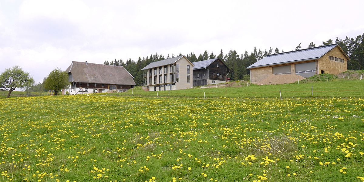 Das neue Wohnhaus befindet sich an der gleichen Stelle des alten Leibgedings. Es wird von Nordosten erschlossen und öffnet sich dann mit weitem Blick ins Tal nach Südwesten. Durch die Hanglage ist das Untergeschoss nur zum Teil im Hang und kann vollwertig belichtet als Vollgeschoss genutzt werden.