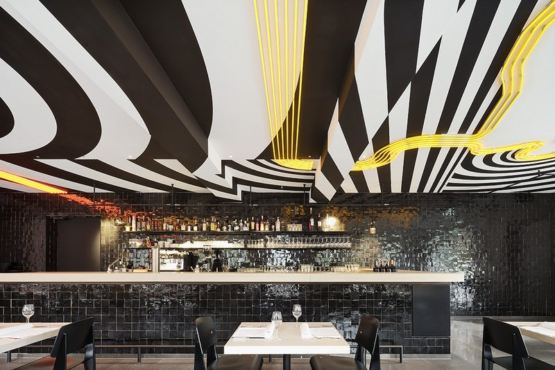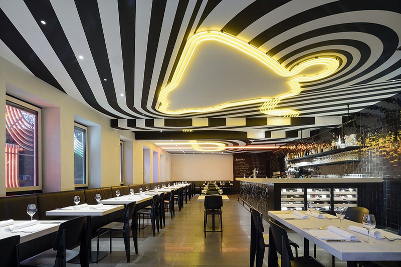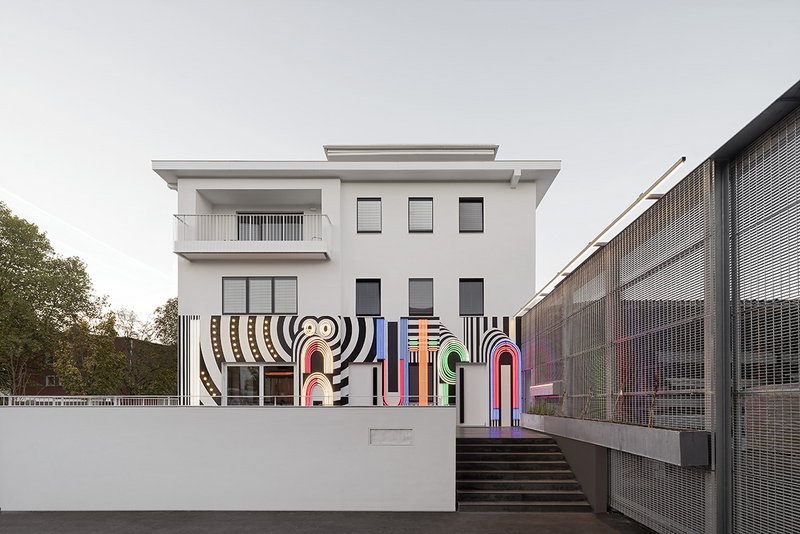 In einem unwirtlichen Kontext im Gewerbegebiet des Ortsteils Wangen an der Peripherie der Stadt Stuttgart wurde das neue Restaurant in Zusammenarbeit mit dem Künstler Tobias Rehberger aus Frankfurt zu einem unverwechselbaren, besonderen Ort gestaltet. Das Spiel mit Gegensätzen: schwarz und weiß, warm und kalt, weich und hart, einfach und komplex, prägt das Haus. Die neue, bewusst glatte und eher abstrakte Gestaltung des Gebäudes bildet einen zurückhaltenden, architektonischen „Rahmen“ für das in Fassade und Decke integrierte Kunstwerk.