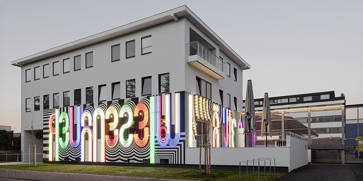 Mit seiner Fassadeninstallation am Restaurant “Wiesenauerläuten” setzt Tobias Rehberger dessen Wirtshausschild als eine geschosshohe, leuchtende Grafik um, die über Fenster hinweg das halbe Gebäude umspannt. Dabei ist der Name des Restaurants auf zwei Seiten verteilt: Auf der Längsseite zur Straße hin kann man in Spiegelschrift “Wiesenauer” lesen, wobei die Spiegelung den Betrachter quasi zwingt, seine Perspektive mental ins Gebäude hinein zu versetzen. Daran anschließend steht auf der Schmalseite, dort wo der Eingang ist, in nicht gespiegelten Lettern das Wort “läuten”. Die Lichtinstallation setzt sich an der Decke des Gastraums mit der grafischen Darstellung einer Glocke fort und macht das Gebäude zu einer begehbaren Skulptur. Diese Glocke visualisiert nicht nur das Läuten aus dem Namen des Lokals, sondern ist auch eine Reminiszenz an das ursprüngliche Restaurant dieses Namens der Familie Wiesenauer, in dem das berühmte Gericht “Gaisburger Marsch” erfunden worden sein soll. Anstelle eines historischen Wirtshausschilds leuchtet sie über den Köpfen der Gäste und spiegelt sich in allen glänzenden Oberflächen, dem Geschirr und Besteck.
