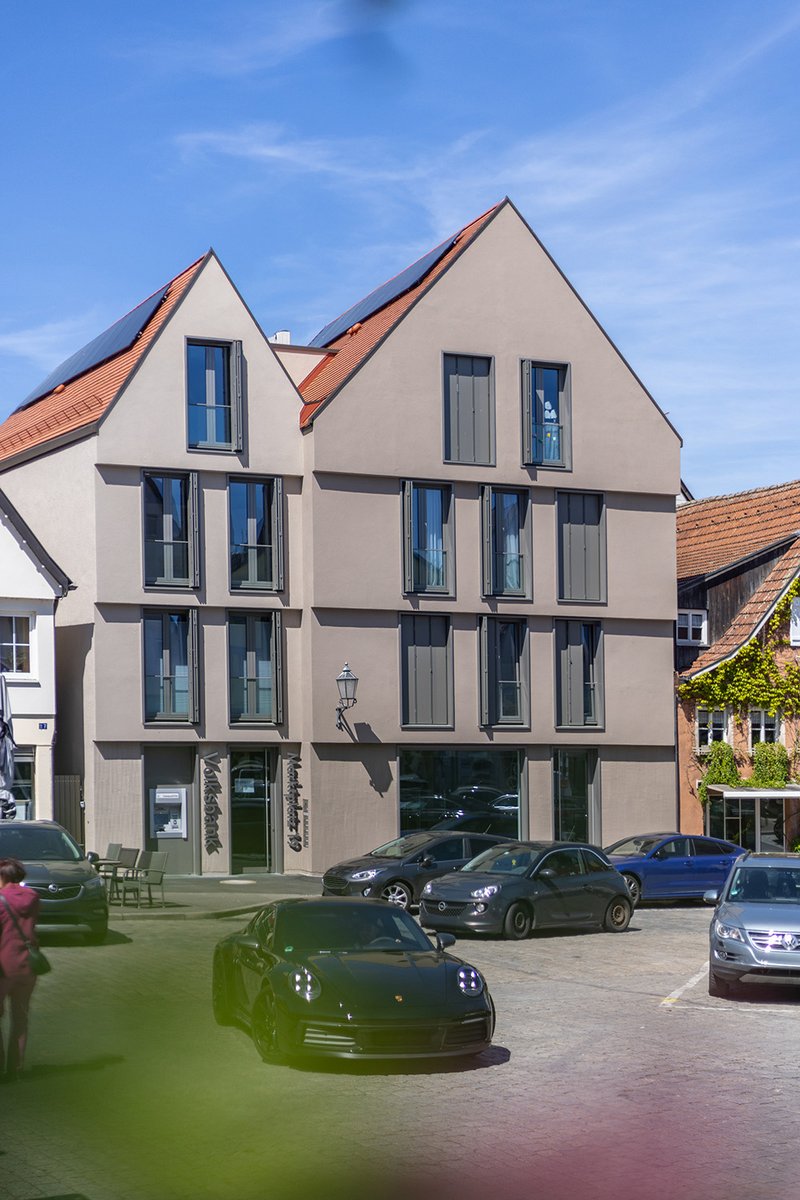 Materialität und GestaltungDas Materialkonzept orientiert sich bewusst an der historischen Umgebung, ohne sich ihr unterzuordnen. Ein gekämmter Putz im Sockelbereich betont das Erdgeschoss und verleiht dem Haus eine klare Basis, während die Obergeschosse mit einem fein strukturierten Putz ruhig und zurückhaltend wirken. Faltschiebeläden übernehmen die Verschattung und zitieren auf moderne Weise das Bild klassischer Klappläden im Altstadtbild. Biberschwanzdeckung und zurückhaltende Farbtöne greifen traditionelle Elemente der Altstadt auf und übersetzen sie in eine moderne Architektursprache.