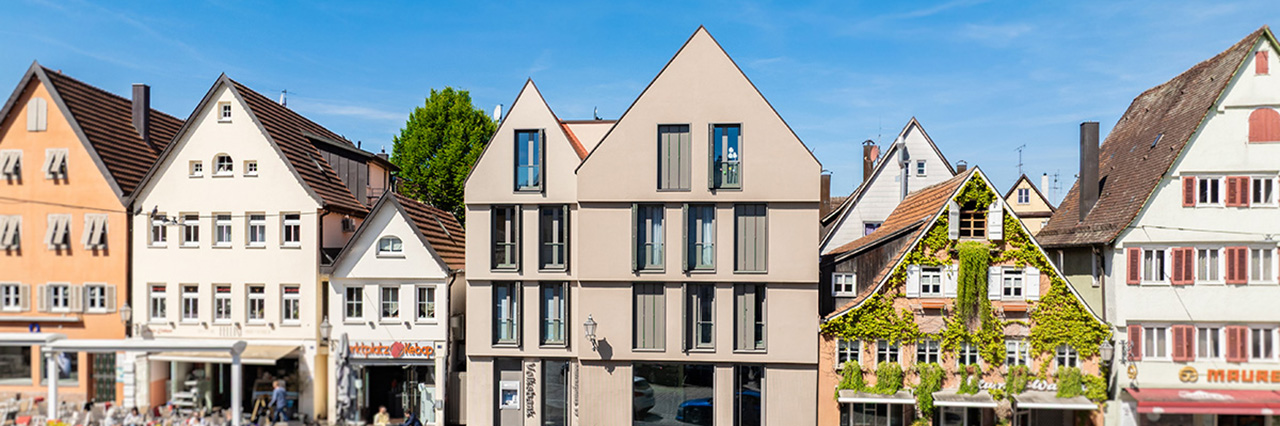 Zwei Stadthäuser als sensibler Neubau im historischen StadtkernMit dem Neubau zweier Stadthäuser am unteren Marktplatz in Schorndorf wurde ein in die Jahre gekommenes Wohn- und Geschäftshaus ersetzt, dessen baulicher Zustand und räumliche Struktur nicht mehr den heutigen Anforderungen entsprach. Die Projektaufgabe bestand darin, inmitten eines denkmalgeschützten Gebäudeensembles der Innenstadt ein neues Haus zu schaffen, das sich sowohl gestalterisch als auch funktional in den historischen Stadtraum einfügt – und gleichzeitig zukunftsfähigen Wohn- und Arbeitsraum bietet.