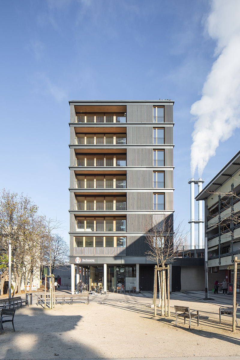 Das Gebäude ist ab dem ersten Obergeschoss komplett in Holzbauweise erstellt, einschließlich der Treppenhäuser und des Aufzugschachtes, was für die Gebäudeklasse 5 zum Zeitpunkt der Fertigstellung einmalig war. Die Oberkante des Fertigfußbodens des obersten Geschosses liegt mit 21,98 m zwei cm unterhalb der Hochhausgrenze.