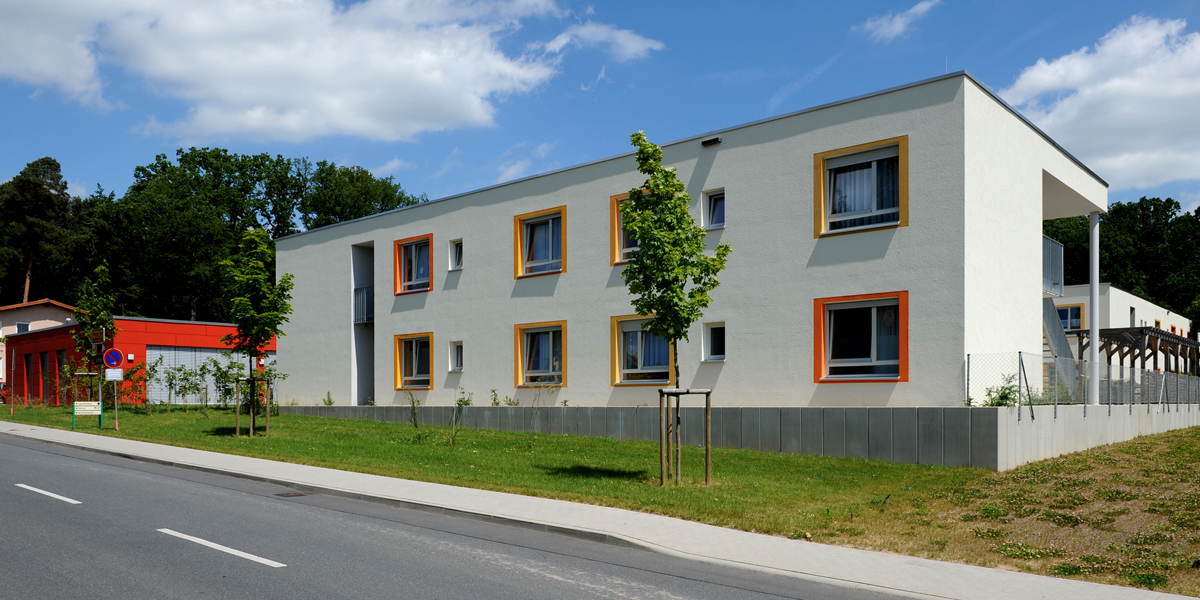 Die neue Wohnanlage gliedert sich in drei windmühlenartig um ein zentrales Erschließungselement angeordnete Flügel, die bedingt durch ihre L-Form, verschiedene Innenhöfe bilden.Im Erdgeschoss sind die Verwaltung, Technik und Lagerräume sowie zwei Wohn-/Pflegegruppen untergebracht, die direkt dem Freibereich angegliedert sind. Im Obergeschoss befinden sich drei weitere Wohn-/Pflegegruppen. Über das zentrale Treppenhaus mit zwei Aufzügen und einer einläufigen Treppenanlage sind alle Wohn-/Pflegegruppen miteinander verbunden. Den einzelnen Gruppen sind Wohnhöfe zugeordnet, die durch die in den Gruppen mittig angeordneten Gemeinschaftsbereiche über Terrassen oder Balkone zugänglich sind.Das zweigeschossige Gebäude ist nicht unterkellert. Dem Haupteingangsbereich ist ein Vorplatz vorgelagert, der durch den freistehenden und eingeschossigen Baukörper der Tagesstruktur zoniert und gemeinsam genutzt wird.