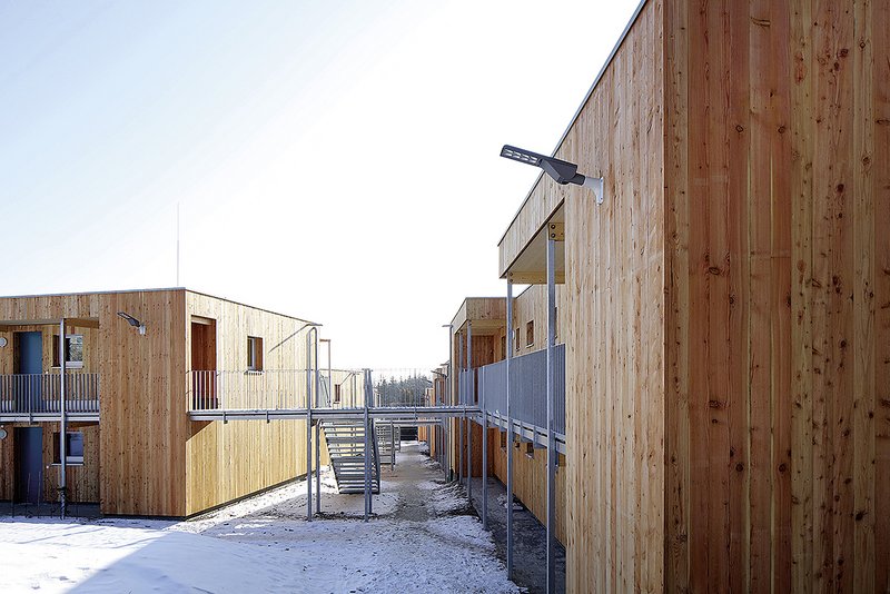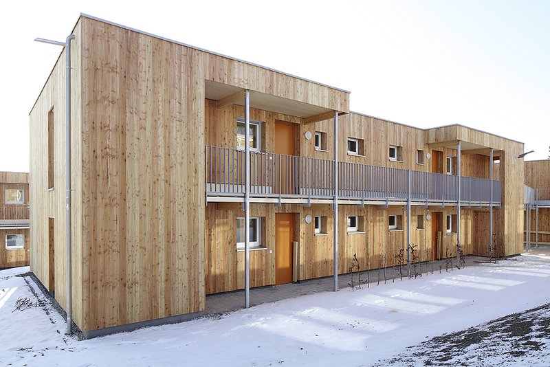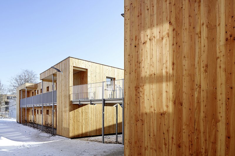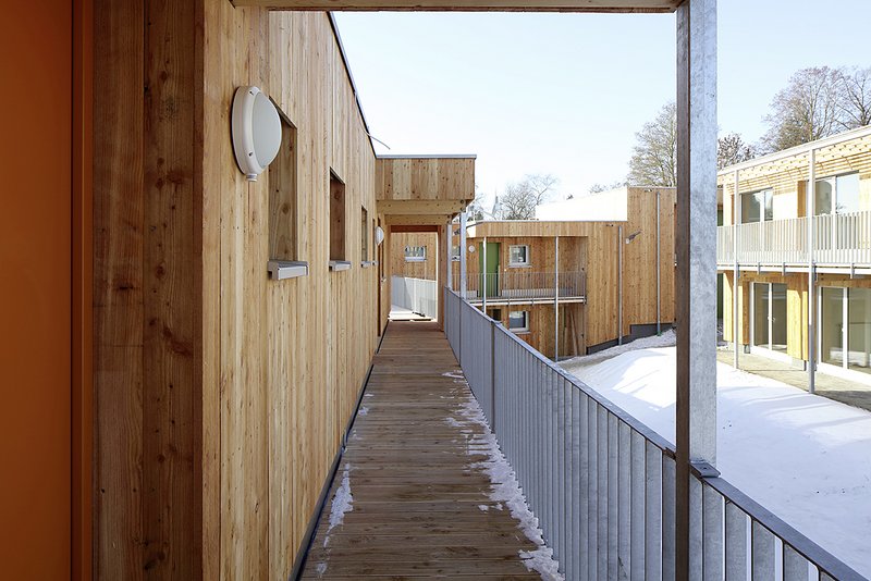 Zur großzügigen Gartenseite hin sind kleinere Plätze sowie eine Boule-Anlage vorgesehen, die nicht nur hohe Aufenthaltsqualität bieten, sondern auch als Treffpunkt zur Stärkung der Gemeinschaft dienen.Alle Riegel sind in Holzständer Bauweise auf einer tragenden Betonplatte ausgeführt. Dabei sind die jeweiligen Decken und das Dach als Brettstapeldecke konstruiert. Das Flachdach wurde begrünt, die Fassade mit einer senkrechten Holzschalung versehen. Damit wird die Vertikalität der Fensterformate aber auch des gesamten Gebäudes unterstrichen.