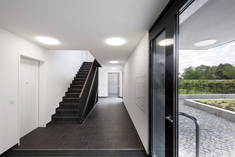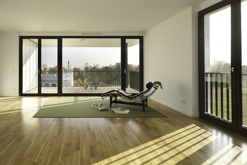 Der Hauseingang wird durch ein breites Türelement unter einem markanten Betonvordach betont und über eine einfache Treppen-/Rampenanlage barrierefrei erschlossen. Im Gebäudeinnern bilden sich im Erdgeschoss großzügige Eingangsbereiche mit Sitzgelegeheiten und ausreichend Platz für Kinderwagen. Alle Treppenhäuser sind außenliegend oder über ein Treppenauge natürlich belichtet und unterstreichen in Ihrer Gestaltung den Anspruch, hochwertige Wohnqualität zu schaffen.In den unterschiedlichen Häusern wurde eine Vielzahl an Wohnungstypen realisiert, wobei der Schwerpunkt auf 3- und 4-Zimmerwohnungen liegt. Die klar strukturierten Grundrisse zeichnen sich durch großzügige Eingangssituationen und eine konsequente Trennung in den ‚öffentlichen‘ und ‚privaten‘ Teil der Wohnung aus. Fast alle Wohnungen sind dreiseitig orientiert und erhalten in allen Räumen eine differenzierte Besonnung und Belichtung. Die Wohn- / Essbereiche verfügen über offene Küchenkonzepte und sind dadurch ebenfalls zu mehreren Himmelsrichtungen orientiert. Alle Wohnungen haben außenliegende Bäder, welche sorgfältige Berücksichtigung bei der Entwicklung der Fassaden gefunden haben.Alle Gebäude sind mit tragenden Außenwänden aus einem Ziegelsystem ohne außen aufgebrachte Wärmedämmung errichtet und erreichen den KfW- Standard ‚Effizienzhaus 85‘.