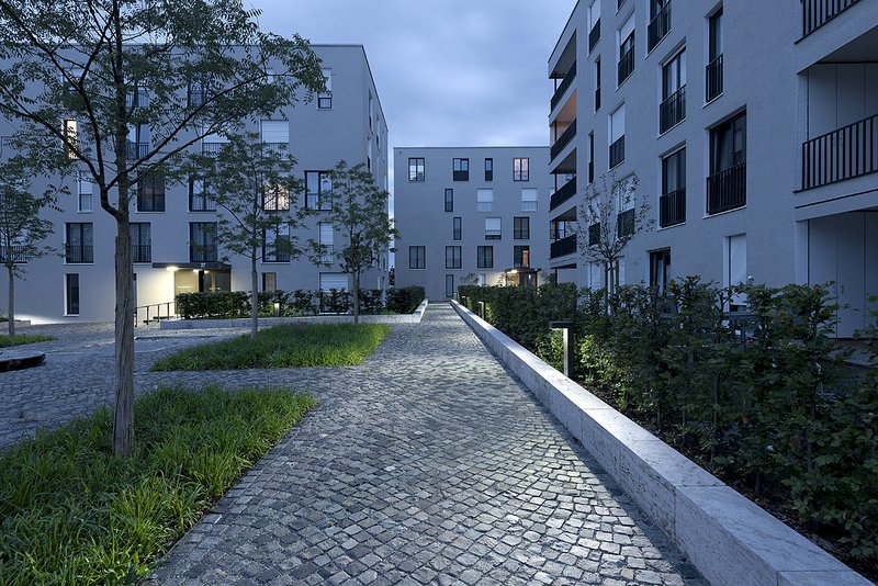 Am Westrand inszeniert ein kleines Belvedere die Aussichtssituation am Stadtrand. Die Erdgeschossgärten sind von den Gemeinschaftsflächen durch hüfthohe Buchenhecken abgetrennt. Sie definieren Privatsphäre und beruhigen den Gesamteindruck, ohne die Gestaltungsfreiheit der Bewohner zu sehr einzuschränken. Die Gartenflächen liegen hinter den Aufkantungen etwa 30 cm höher, die abschirmende Wirkung der Hecken wird so unterstützt. Weite Teile der Freianlagen sind mit Tiefgaragen unterbaut, wobei die Natursteinaufkantungen eine großflächige Intensivbegrünung ermöglichen. Die natürliche Entlüftung wurde möglichst unauffällig integriert und Fluchtwege über die Wohnhaustreppenhäuser geführt.