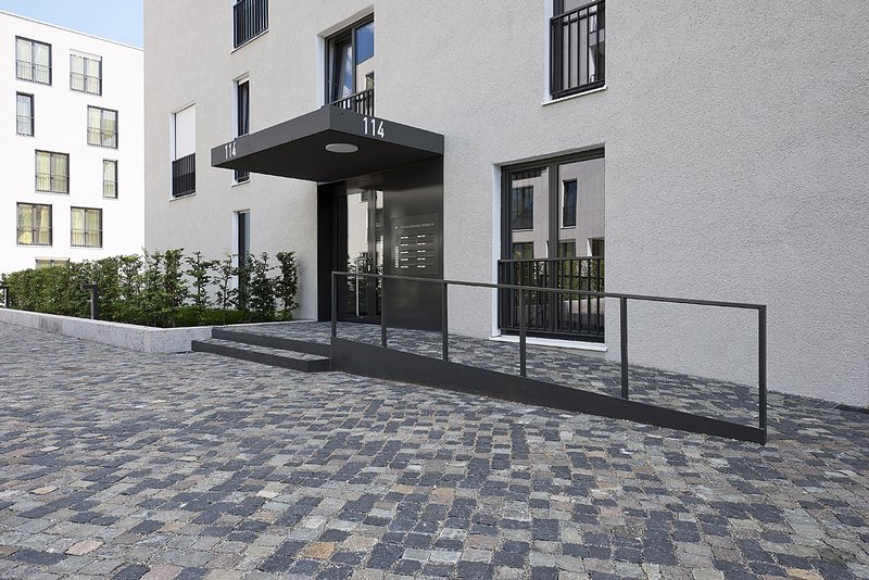 Die Wege zu den Hauseingängen verweben sich zu einem Netz, das differenziert auf die unterschiedlichen räumlichen Situationen reagiert und unterschiedliche Freiraumtypen ermöglicht. Entlang der Wegeflächen aus Basaltpflaster laufen durch die gesamte Anlage lange Aufkantungen aus monolithischen Muschelkalkblöcken. Ihr gleichmäßiger Höhenverlauf unterstützt den Eindruck, dass diese Bänder die gesamte Anlage – trotz ihrer räumlichen Vielfalt – beruhigen und ‚zusammenbinden‘. Jedem Hauseingang ist eine kleine Aufweitung und ein individuell bepflanztes Hochbeet zugeordnet, so entsteht für jedes Haus ein eigener, unterscheidbarer Eingangsbereich. Zwischen den Häusern entstehen zwei Hofsituationen. Der größere Hof zeigt sich als Sonnenhof mit Spielangeboten und einer lichten Bepflanzung aus federblättrigen Schnurbäumen, die breiten Pflasterfugen werden hier bald einen grünen Schimmer erzeugen. Der anschließende kleinere Hof ist dicht mit mehrstämmigen Birken bepflanzt, ein kleiner Quellstein wird die ruhige Atmosphäre betonen.