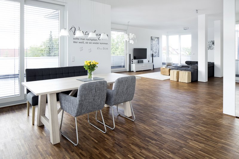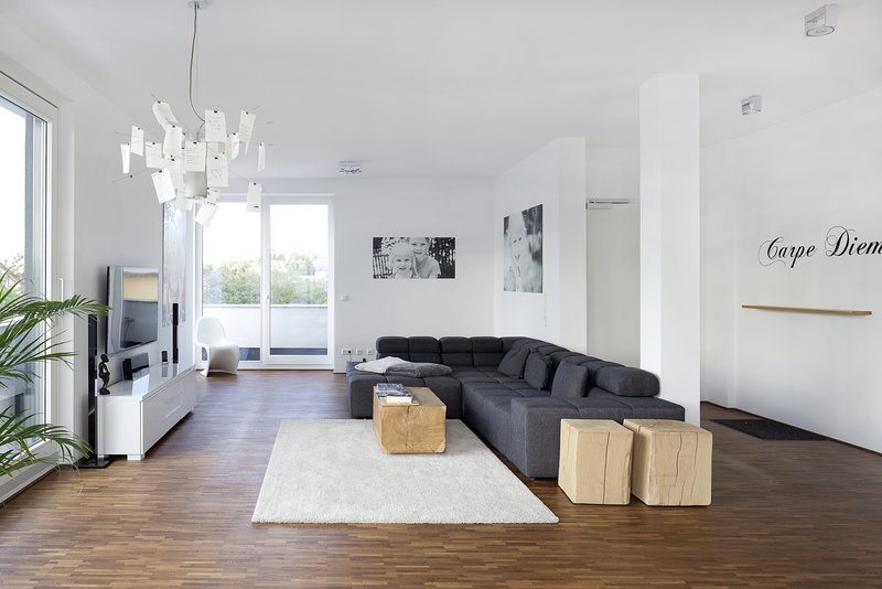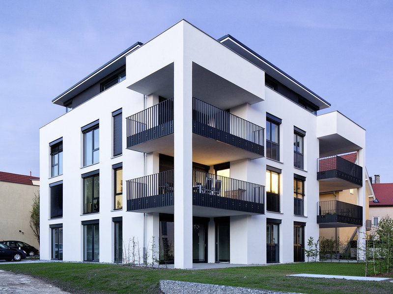 Konstruktion, Material, FarbeDie tragenden Bauteile bestehen aus Stahlbeton und Kalksandvollstein. Aufgrund bauphysikalisch abgestimmter Detaillösungen verfügen alle Wohnungen über einen erhöhten Schallschutz. Sie sind qualitätsvoll ausgestattet mit großflächigen, raumhohen Verglasungen, bodengleichen Duschen und Massivholzparkett. Das Farbkonzept der Anlage ist angenehm zurückhaltend in weiß und anthrazit gehalten.