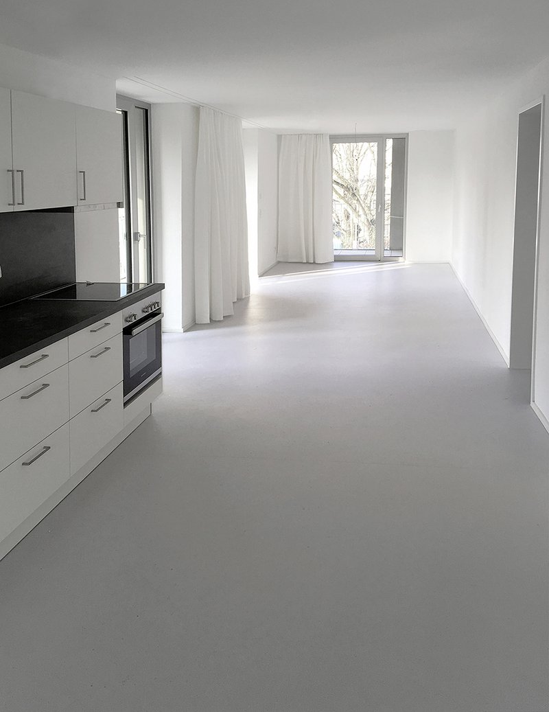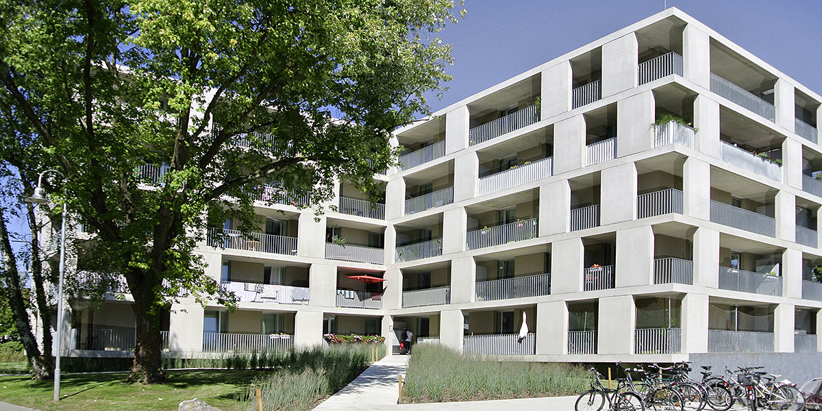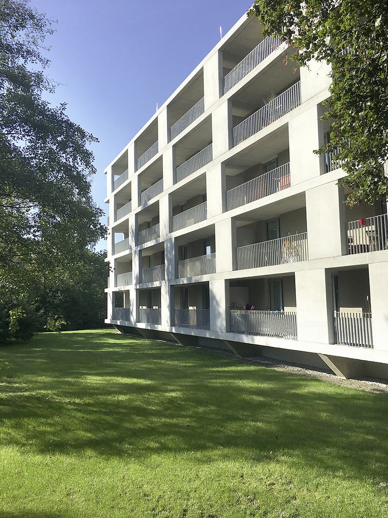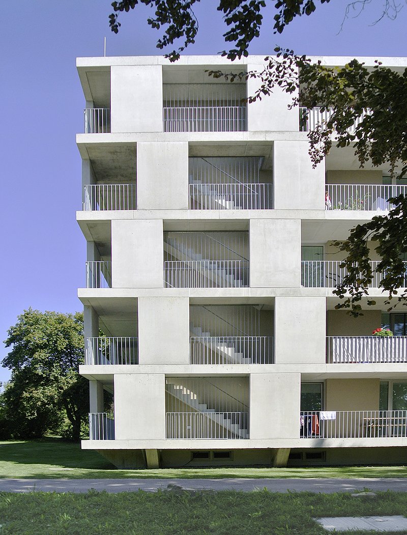 Mitten in einem parkartigen Gelände zeigt sich das ehemalige Schwesternwohnheim der Spitalstiftung in neuem Gewand. Hinter der spielerischen Sichtbetonfassade verbirgt sich ein Bestandsgebäude aus den 60er Jahren, das wegen neuer Bedürfnisse grundlegend umgebaut und energetisch saniert wurde. Dabei wurde die Tragstruktur aus Schotten beibehalten und um einen umlaufenden Ring aus Laubengängen und Balkonen ergänzt. Die alte Mittelflurerschließung wurde nach außen verlegt, sodass 34 durchgesteckte Wohnungen mit Querlüftung und Balkon in verschiedenen Grössen enstehen konnten. Die kostengünstigen Wohnungen stehen Mitarbeitern der Spitalstiftung und des Klinikums zur Verfügung. Wenige Materialien prägen das neue plastische „Gesicht“ des Gebäudes: rhythmisch gesetzte Sichtbetonscheiben, warmtoniger Aussenputz mit Kellenstrich und metallischer Lasur sowie Fensterelemente und Geländer aus Metall. In der Kernzone sorgt eine grosszügige Stahltreppe mit Aufzug für die barrierefreie Erschließung der fünf Wohngeschosse. Alle Wohnungen sind mit Einbauküchen und wärmereflektierenden Vorhängen ausgestattet. Die Laubengang- und Balkonzone ist Erweiterung des Wohnraums, privater Aufenthaltsbereich und geschützte Zone zwischen Innen und Außen. Durch den Rückversatz des Sockels scheint das Gebäude über dem Gelände zu schweben. Der neu gestaltete Eingangshof mit Gräserfeldern und Wegen in Beton ist das Entrée des Gebäudes und fügt sich mit leisen Tönen in die bestehende Parklandschaft ein.