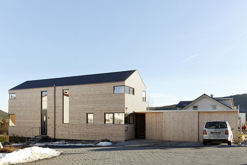 Entwurf und UmsetzungDas Entwurfskonzept geht auf die zweiseitige Straßensituation und Topographie ein. Hieraus leitet sich die Anordnung der räumlichen Struktur ab. Auf der Nordseite befindet sich der Hauptzugang mit Treppenhaus, welches eine spätere geschossweise Trennung ermöglicht.Die nordöstliche Ecksituation nimmt das Arbeitszimmer ein, welches sich über die gesamte Giebelseite bis zur Südostecke erstreckt, mit Aussicht über den Ort bis nach Tuttlingen. In der Nordwestecke des Gebäudes ist die Küche angeordnet mit Sicht auf die Straßenkreuzung und den Garagenvorplatz. In der Verlängerung des Hauses schließen Carport und Garage an und bilden den Grundstücksabschluss nach Westen. Über den Carport wird der Nebeneingang erschlossen, der über einen Garderobenraum in den Wohnbereich führt. Bei einer Teilung des Hauses könnte er als Haupteingang für das Erdgeschoss genutzt werden. Über die Südseite erstrecken sich Essplatz und Wohnzimmer mit vorgelagerter Terrasse. Im Obergeschoss befinden sich nach Süden orientiert die vier Schlafräume. In der Nordwest- bzw. in der Nordostecke ist jeweils ein Bad angeordnet. Im Untergeschoss (das Wohnhaus ist teilunterkellert) befindet sich nach Süden der Wellness- und Gästebereich, nach Osten die Haustechnik sowie der Hauswirtschaftsraum.