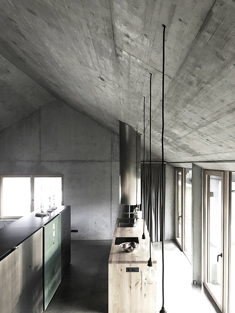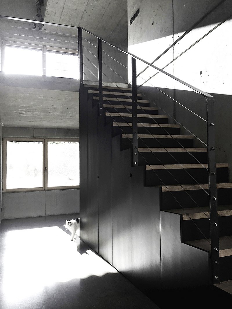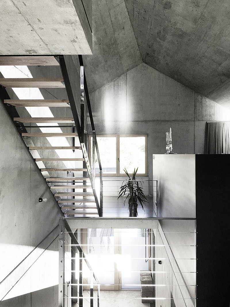 Böden, Wände und Dach bestehen fast gänzlich aus Stahlbeton und wurden innen sichtbar belassen. Bewusst in keiner Sichtqualität ausgeschrieben, lag das Augenmerk auf einer handwerklich ordentlichen Ausführung, d.h. Verwendung fast neuwertiger Standardschalung, abschnittsweises Betonieren einzelner Wände zur Erzielung eines einheitlichen Schalungs- und Ankerbildes. Neben dem gewünschten rohen Charakter bedeutet der Verzicht auf Sichtschalung, Putz, Anstrich sowie jegliche Fußbodenaufbauten auch eine deutliche Kostenersparnis.