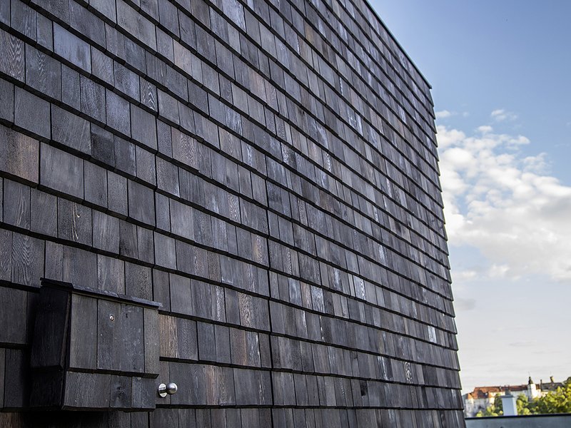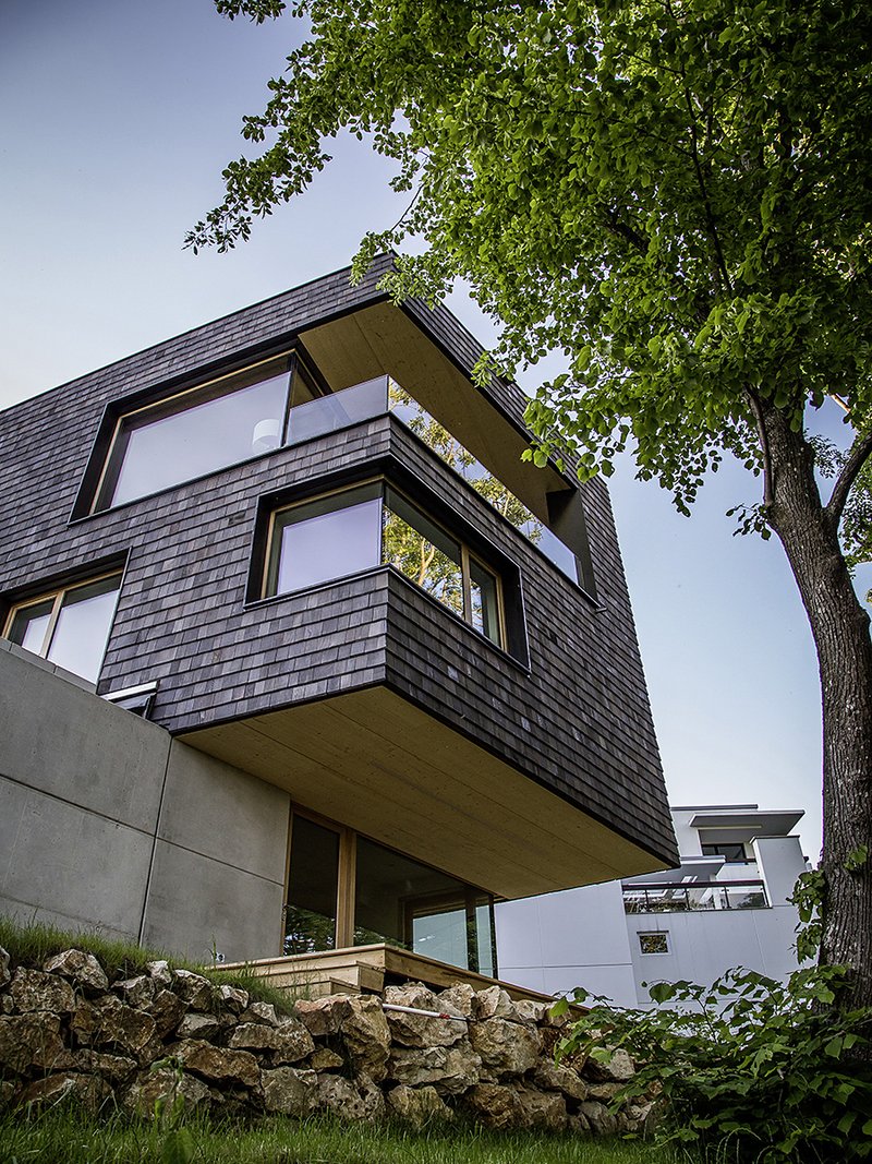 Das war der Vorsatz und die grundlegende Idee für den Entwurf des Einfamilienhauses in der Zeppelinstraße 20. Dies sollte sowohl von der äußeren Architektursprache als auch vom Innenraum erkennbar und spürbar sein. Die Entscheidung, eine Schindelfassade zu bauen, war daher eine folgerichtige Weiterführung der Entwurfsidee. Die einzelnen Holzschindeln aus Rotzeder wurden in Handarbeit mit einem nicht deckenden Anstrich versehen, welcher ein homogenes, jedoch auch lebendiges Fassadenbild ermöglicht. Die naturbelassenen Eichenrahmen der Holzfenster bewirken einen sichtbaren Kontrast zur dunkelchangierenden Schindelfassade. Auch im Innenraum war es den beiden Architekten wichtig, die verwendeten Baumaterialien bewusst zu zeigen. Sichtbetonwände, eine massive Holzdecke und Eichenparkett prägen den innenräumlichen Eindruck des Einfamilienhauses.