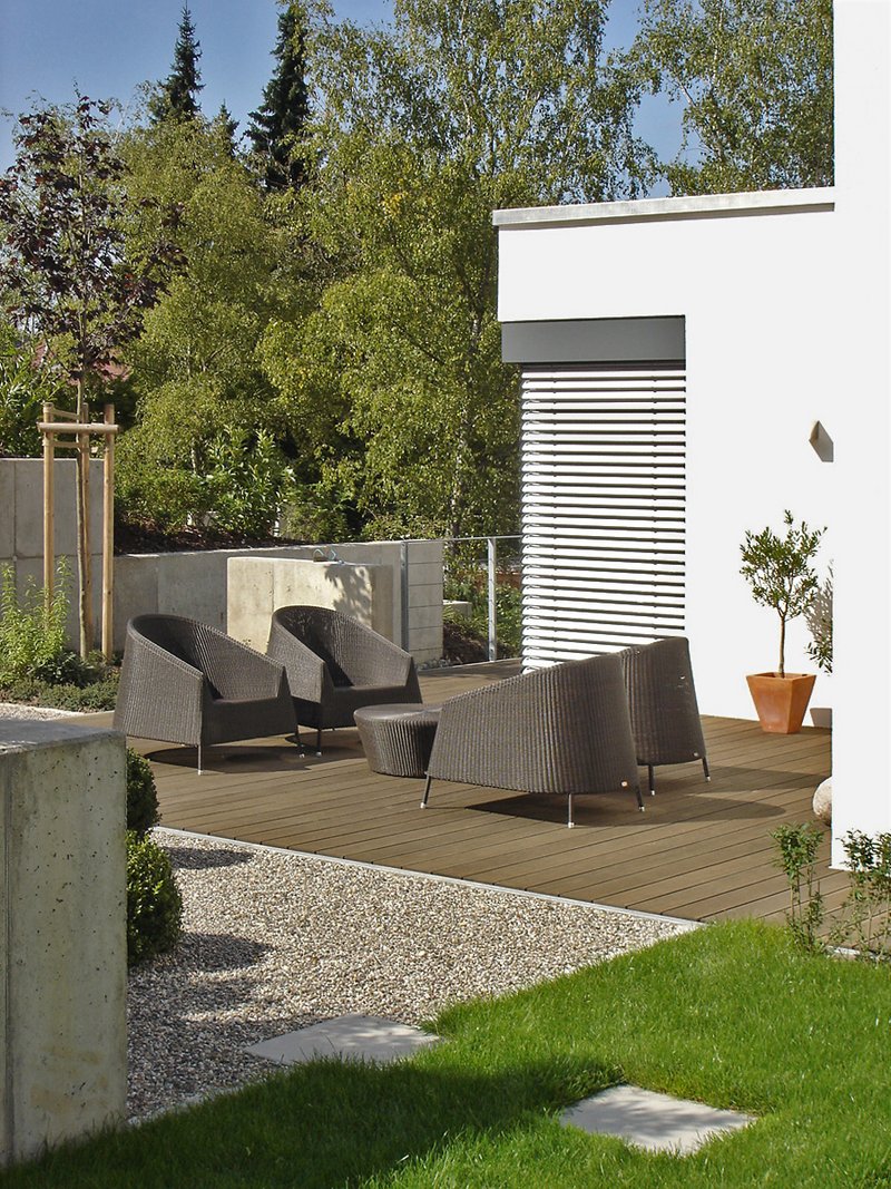 Im Garten konnte, trotz der Hanglage, durch den Einsatz schlichter Sichtbetonwände, ein fast ebenes Gelände rund ums Haus geschaffen werden. Die ruhige Bepflanzung und ein Wasserbecken nahe der Terrasse unterstreichen den Gesamteindruck. Ein Freisitz mit Baum als erhöht angelegte Terrasse bietet eine weitere Sitzmöglichkeit zum Verweilen im Schatten.