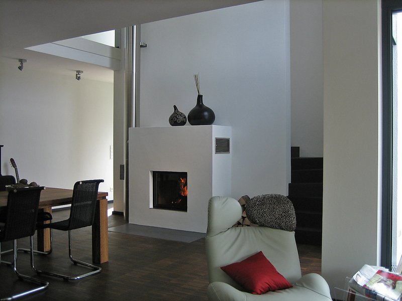 Die einfache Gestaltung der Außenfassade als weiße Putzfassade setzt sich auch im Innenbereich konsequent fort: Heller Modellierputz, dunkle Räuchereicheböden und eisengraue Fensterelemente geben dem Gebäude ein ruhiges Ambiente ohne überflüssigen Zierrat. Die Terrasse ist mit einem optisch warmen Holzdielenbelag versehen.
