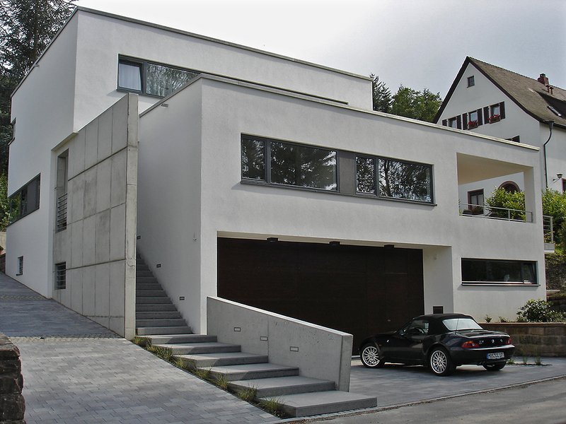 Das Planungsziel, ein Wohngebäude mit schlichten Formen, kubisch, stadtnah und in ruhiger Wohnlage, wurde umgesetzt. Eine Grundstücksteilung des Vorbesitzers ermöglichte den Erwerb des Hanggrundstücks in Mosbach, welches sich für die Realisierung der Planungsvorstellungen als bestens geeignet erwies.