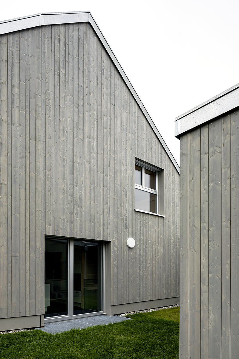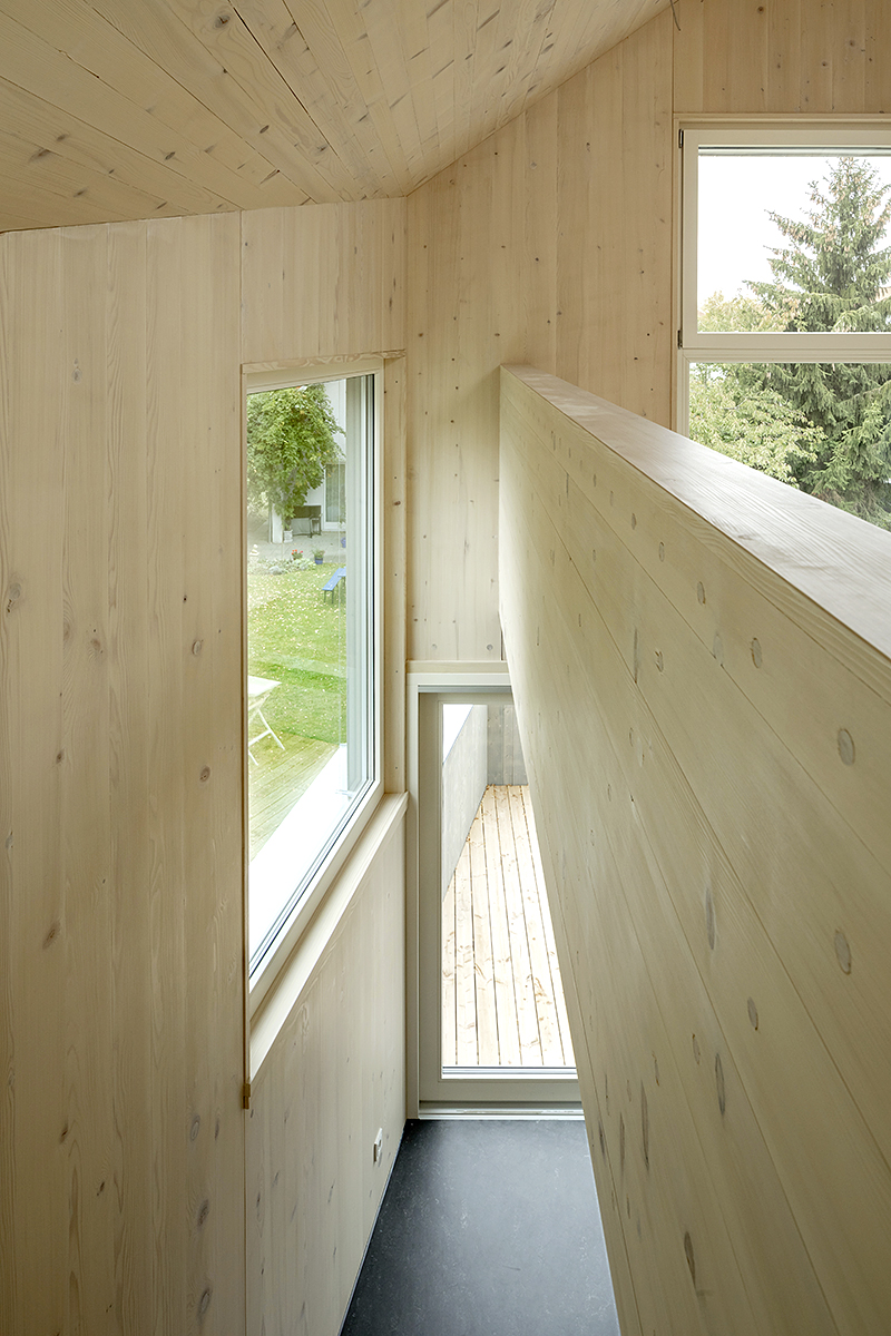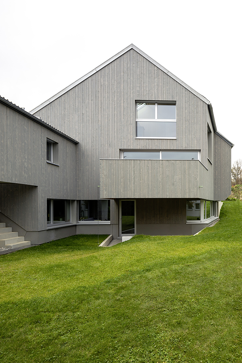 NachhaltigkeitFamilieneigenes Bauholz (Weißtanne) dient sowohl der als Massivholzelement gefügten Konstruktion (Dach, Decken und Wände) des Gebäudes als auch seinen Oberflächen der Außenfassade. Das Gartengeschoss mit hohem Anteil von erdberührten Bauteilen im Hang ist aus sichtbar belassenem Stahlbeton.