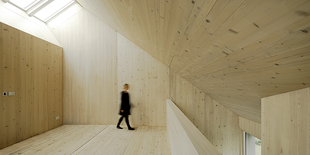 Visueller RundwegGezielt gesetzte Öffnungen und Bewegungsräume um den inneren Kern generieren einen visuellen Rundgang mit architektonischer Dichte, die Positionierung der Fensterflächen ist eine Reaktion auf die vorgefundene Umgebung und schützt das Innere vor Einblicken von außen bei gleichzeitig maximaler Offenheit und Transparenz.Während sich das Gebäude zur Straße hin unauffällig und geschlossen präsentiert, orientiert es sich in Richtung Gartenseite mit offener und ausladender Geste. Die Positionierung der Fenster spielt eine zentrale Rolle: das Entrée, nach oben offen, reagiert zur Straße hin mit einem tiefliegenden Fensterband nahe des Fußbodens und großen Dachfenstern oben, welche den Innenraum mit viel Tagesnordlicht versorgen, ohne dabei Einblicke in die Privatsphäre zu gewähren. Der Tageswohnbereich öffnet sich nach allen Seiten über eine große Sitznische im Erker, über die zugeordnete Balkonaußenfläche und zur ebenerdigen Gartenfläche im Hofbereich sowie einem höhenversetzten Fenster nach oben hin.Die privaten Räume der Gartenebene liegen auf Niveau der zum Haus hin flach abfallenden Wiesenflächen. Der Wohnbereich unter der Dachfläche öffnet sich in der Verlängerung der Dachuntersicht zum Himmel hin.