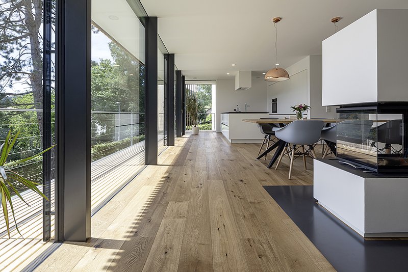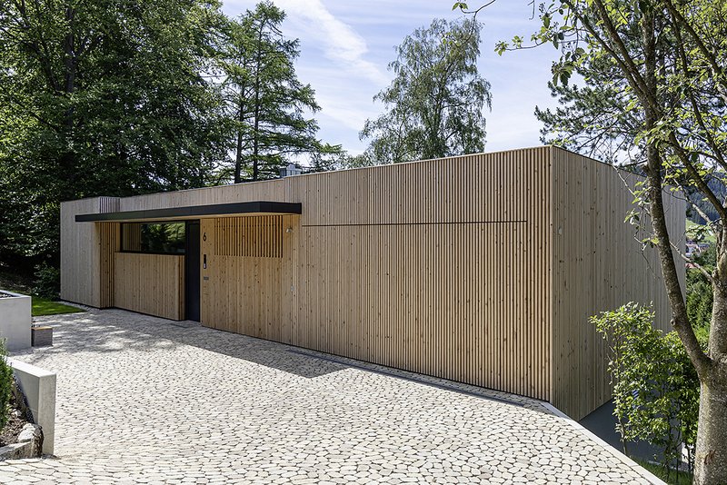 Das WohnhausDas Wohnhaus gliedert sich in ein Eingangs- und ein Gartengeschoss. Über die Nordseite erreicht man das Gebäude über die Hofeinfahrt und einen überdachten Eingangsbereich. Im Eingangsgeschoss befindet sich der nach Süden hin ausgerichtete und verglaste Koch-, Wohn und Essbereich. Daran schließt sich eine Terrasse mit umlaufender Loggia an. Weitere Nebenräume sowie die Doppelgarage finden ebenfalls im Eingangsgeschoss ihren Platz. Im Gartengeschoss befinden sich alle privaten Räume der Familie mit direktem Gartenzugang und nach Süden ausgerichtet. Nebenräume, wie ein Hauswirtschaftsraum, Ankleide, Badezimmer und die Haustechnik sind an der Nordseite angesiedelt. Die reine Wohnfläche des KfW 55 Effizienzhauses beträgt 201,65 m². Errichtet wurde das Eingangsgeschoss des Einfamilienhauses in Holzständerkonstruktion mit Holzfaserdämmung (240 mm) mit zusätzlicher nahtloser Zusatzdämmung aus Holzweichfaserplatten (60 mm). Die Decken wurden als Brettsperrholzdecken ausgeführt. Die Fassade wurde in Weißtanne vorgehängt.