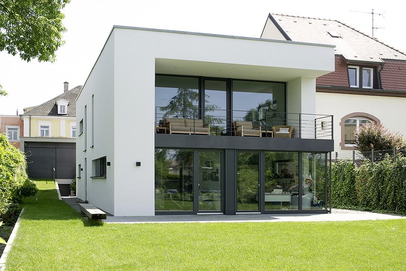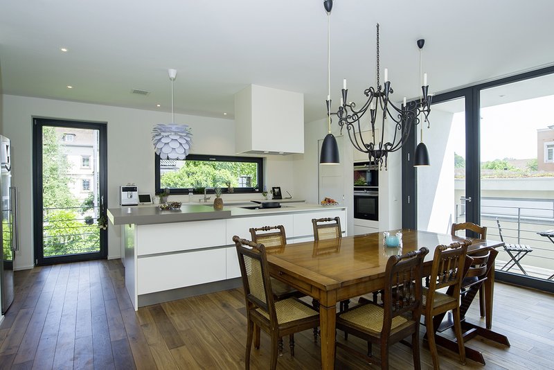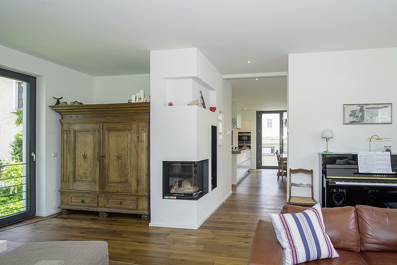 Konstruktion & TechnikDas in Massivbauweise errichtete Gebäudeensemble erreicht mit einem vorbildlichen Wärmeschutz sowie Holzfenstern mit Dreischeibenverglasung den Effizienzhaus-Standard 55. Die hohe Speichermasse unterstützt dabei den durch Raffstore an allen Fenstern generierten sommerlichen Wärmeschutz. Im Winter wird die so gespeicherte Wärme wieder sukzessive an die Räume abgebenen und führt zu einem hohen Maß an Behaglichkeit. Zusätzlich sorgen eine Gasbrennwerttherme plus Plasma-Solaranlage auf dem höchsten technischen Standard zusammen mit der Fußbodenheizung für wohlige Wärme im ganzen Haus.Abgerundet wird das Haustechnikkonzept von einer Komfortlüftungsanlage mit Wärmerückgewinnung.