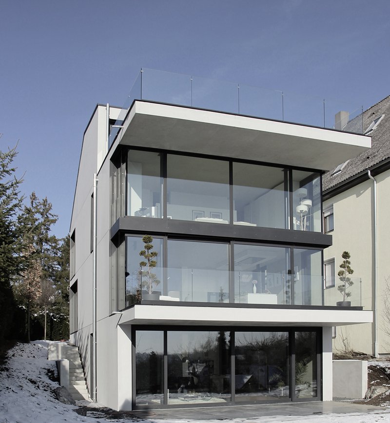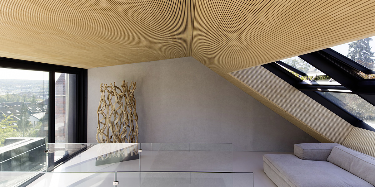 Planung:Das Raumprogramm sah eine Nutzung für nur eine Familie vor, das heißt mit dem vorhandenen Hanggeschoss wäre eine zweigeschossige Bebauung mit Flachdach zur Straße hin völlig ausreichend gewesen. Die Stadt Böblingen bestand jedoch auf einem zusätzlichen, typischen Giebeldach wie bei den Nachbargebäuden. Da das Bauherr und Architekt unpassend, weil zu kleinteilig im Kontext, vorkam konnte man sich schließlich auf eine asymmetrische Dachform mit Öffnung nach Süden und Traufe zur Straße einigen. Durch das zusätzliche Dachgeschoss stiegen zwar die Baukosten - den Raum, den man dadurch im Dach mit der großartigen, vorgelagerten Aussichtsterrasse gewann, möchten die Bauherren jedoch auf keinen Fall mehr missen – so gesehen ein guter Kompromiss mit dem Amt.