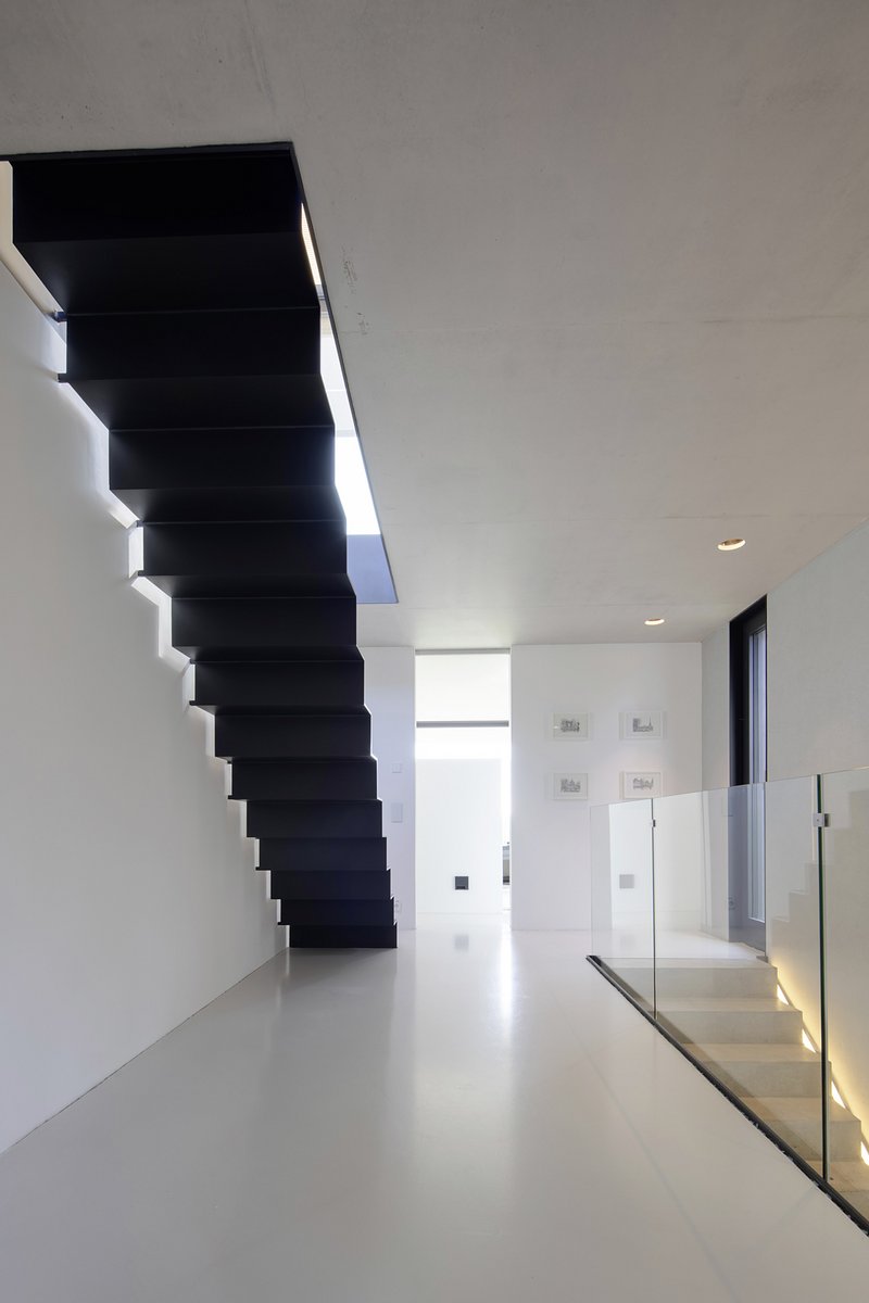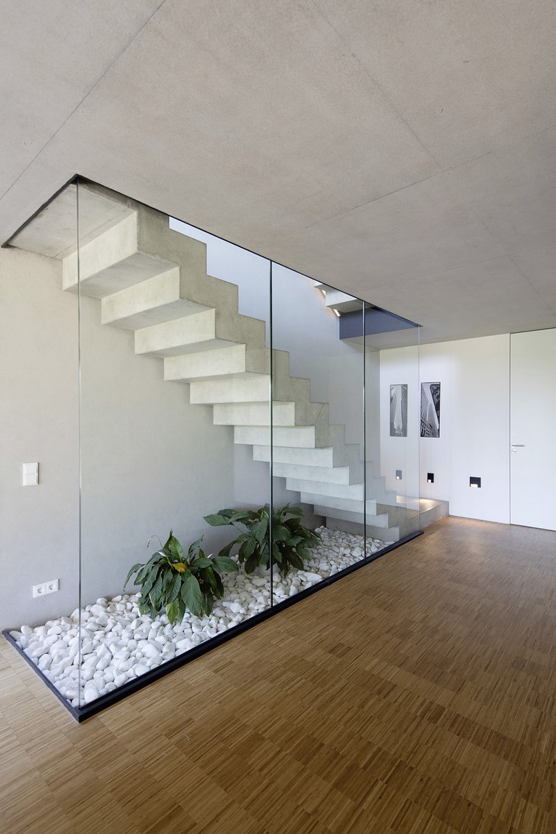 Bauweise:Bauherr und Architekt waren sich schnell darin einig, ein puristisches Haus mit Sichtbeton außen und innen zu bauen. Das gelang mit dem Fertigteilsystem „Syspro-Thermowand“ der Firma Rudolph - ergänzt durch die gefalteten Sichtbetontreppen. Das Lichtkonzept mit integrierten Leuchten und indirektem Licht wurde feinstens darauf abgestimmt. Schwarze Metallfenster mit umlaufenden Rahmen und dunklen Screens unterstreichen die Präzision und das Fugenbild der Fassade. Die Transparenz nach Süden wird außen durch umlaufende Glasgeländer erst vollkommen möglich, im Innern werden dadurch Treppen und Räume optisch freigestellt. Zementäre Bodenbeschichtung, schwarze Stahltreppe, puristische, teils ungewöhnliche Möblierung und Ausstattung der Bäder unterstreichen mit den eingeputzten, raumhohen „Undercover“-Türen den minimalistischen Anspruch. Einzig das hölzerne Dach sowie das Bambusparkett im Untergeschoss bringen im Einklang mit rustikalen Einzelstücken wie dem Baumtisch im Essbereich warme Holztöne kontrastreich ins Spiel.