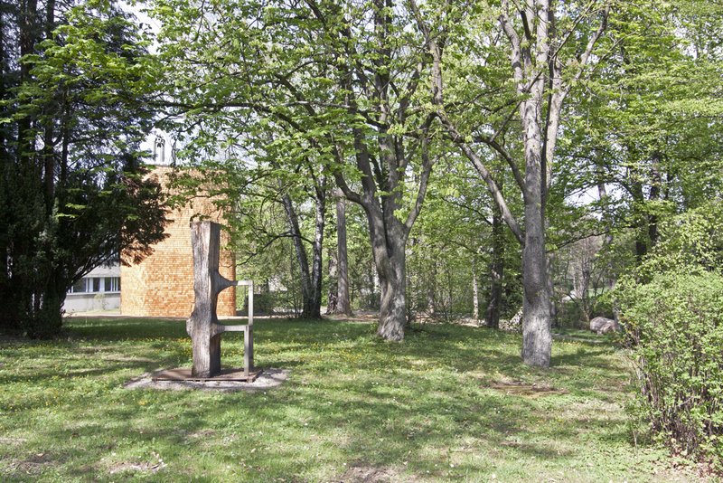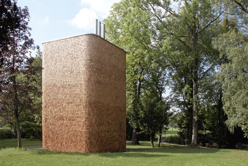 Die Gebäudehülle spielt mit den Grundelementen der Parkanlage – prächtige Bäume, Wiese und dem Spiel von Licht und Schatten. Die umlaufend geschlossene Verkleidung aus unbehandelten, gespalteten Lerchenschindeln prägen aus der Ferne betrachtet den solitären (fast skulpturalen) Gebäudecharakter im Park. Aus der Nähe gesehen ergeben die geschuppt verlegten Schindeln mit ihrer herstellungsbedingten Riffelung eine lebhafte, angenehm natürliche Oberflächentextur.