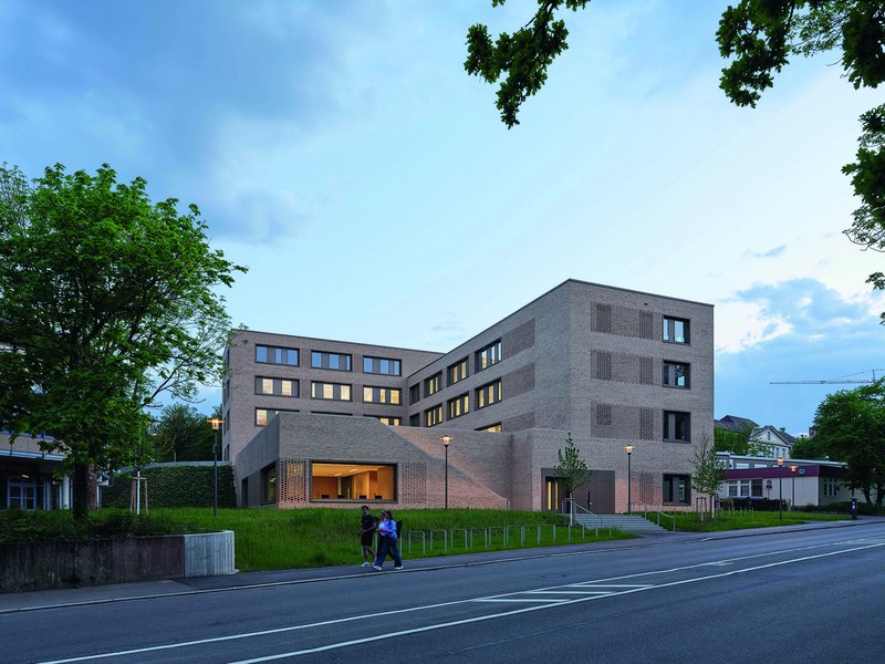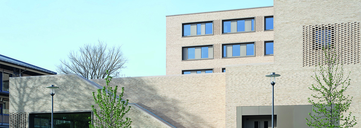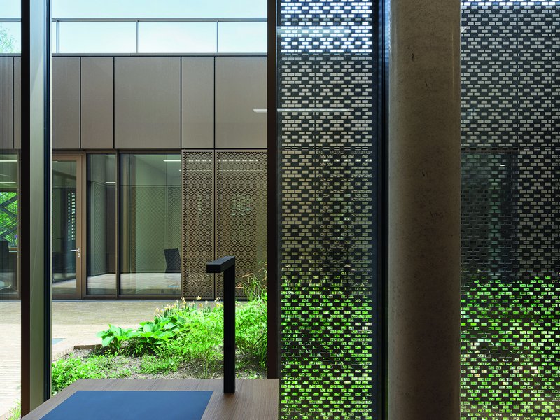 Die Oberflächen-Varianz findet sich auch in der Metallverkleidung des Lichthofs wieder, deren Muster die Struktur des Lochziegelmauerwerks in einem anderen Maßstab zitiert. Zusammen mit den Holzeinbauten, -möbeln und -verkleidungen entsteht so eine ruhige und einladende Studienatmosphäre. Alle Materialien und Fassadenelemente sind auch bei hoher Beanspruchung sehr langlebig und wartungsarm.
