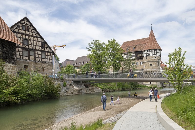Klimaanpassung: Umfangreiche Untersuchungen zur Berücksichtigung eines ausreichenden Abflussquerschnitts für das Hochwasser; Berücksichtigung des Aspekts des Rückbaus bei der Planung des Bauwerks, Baustoffe des Tragwerks lassen sich trennen, wiederverwenden oder ggf. recyceln. Gewässerhydraulik, Hochwasser: Ingenieurbüro Heberle, Rottenburg am Neckar