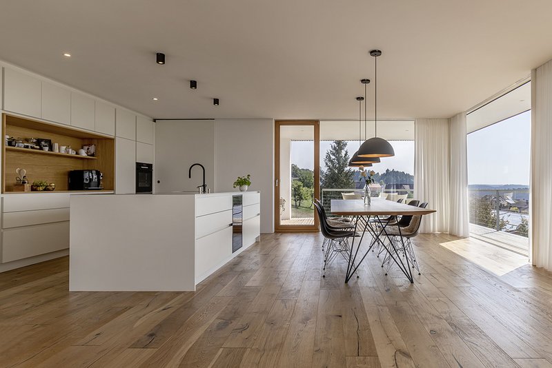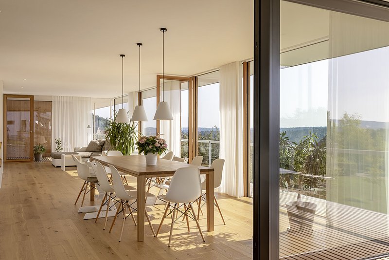 Die im Südwesten bzw. Südosten um ein Primärraster (3 m) und im Süden um ein Sekundärraster (1 m) zurückgesetzten Verglasungen sorgen für den Wetterschutz der überdachten Terrasse/Stege/Balkone. Zugleich dienen sie für die natürliche Beschattung und erzielen hohe Solargewinne. Die hochstehende Sommersonne bleibt draußen und die tiefstehende Wintersonne erwärmt die Räume. Die raumhohen Verglasungen und verglasten Einsatzelemente sorgen für Transparenz und Offenheit. Gleichzeitig hat man vom Sonnenaufgang bis zum Sonnenuntergang einen freien, einzigartigen Blick in den Süd-und Nordschwarzwald. Zur Straße in Richtung Nordenzeigt sich die Gebäudehülle eher geschlossen.