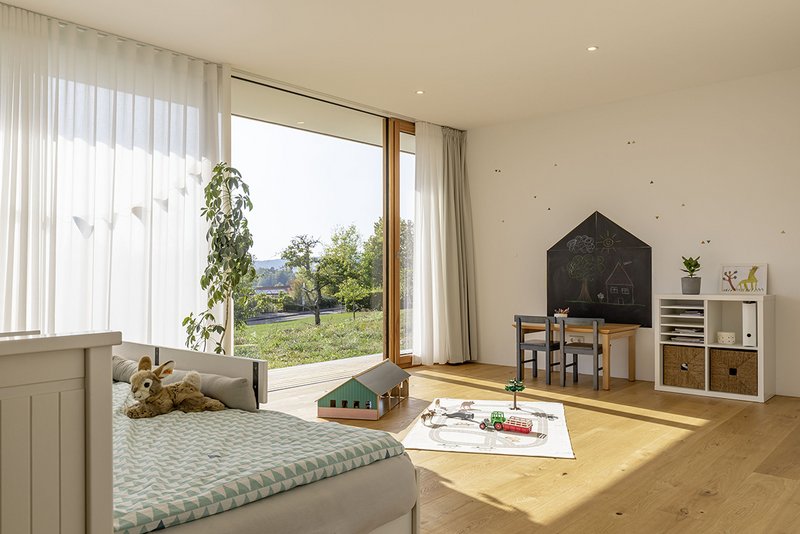 Bautechnik/TragwerkDie Anpassung des Raumprogramms an die Holzrastersystembauweise (Primärraster 3 m, Sekundärraster 1 m) ermöglicht besonders wirtschaftliche Holzbauten mit kurzer Bauzeit. Die effizienten und kostenoptimierten Bauteile werden teilvorgefertigt und mit Holzfaser gedämmt. Einfache, reduzierte Materialwahl, Konstruktionen und Bauteile sowie standardisierte Anschlüsse und Übergänge bestimmen den Entwurf, die weitere Planung, die Projektierung und die Realisierung bis ins Detail. Besonders hohen Wert wird auf baubiologisch unbedenkliche Baustoffe und wohngesundes Bauen gelegt. Es wurden regionale und wo möglich, naturbelassene Materialien bzw. Hölzer verwendet. Die Konstruktion wurde in KVH (Fichte/Tanne) und die Außenbekleidungenin Douglasie ausgeführt. Die Fenster und Türen wurden ebenfalls in Holz (Lärche) ausgeführt. Im Innenbereich wurden Eichenholzböden verlegt. Etwas Besonderes ist, dass Innenwände über beide Geschosse durch Raumteiler/Einbauschränke ersetzt wurden, die beidseitig als Schrankwand nutzbar sind und mit Oberlichtern ausgestattet wurden.