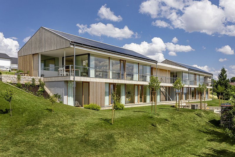 EnergiekonzeptDie Zwillingsbauten wurden als sogenannte ++Energie-/CO2-Aktivhäuser gebaut. Bei den Plusenergiehäusern wird mehr Energie erzeugt als verbraucht wird. Die Atmosphäre wird nicht mit CO2 be-, sondern entlastet. Der durch die Photovoltaikanlage auf der Süddachseite gewonnene Strom wird in eine Hochleistungseffizienz-Luft-Wasser-Wärmepumpe eingespeist. Die Wärme wird über die Fußbodenheizungen verteilt und das Brauchwasser gepuffert. Die vorbereiteten Stromspeicher ergänzen und die Elektro-Ladestation komplettieren das Energiekonzept.