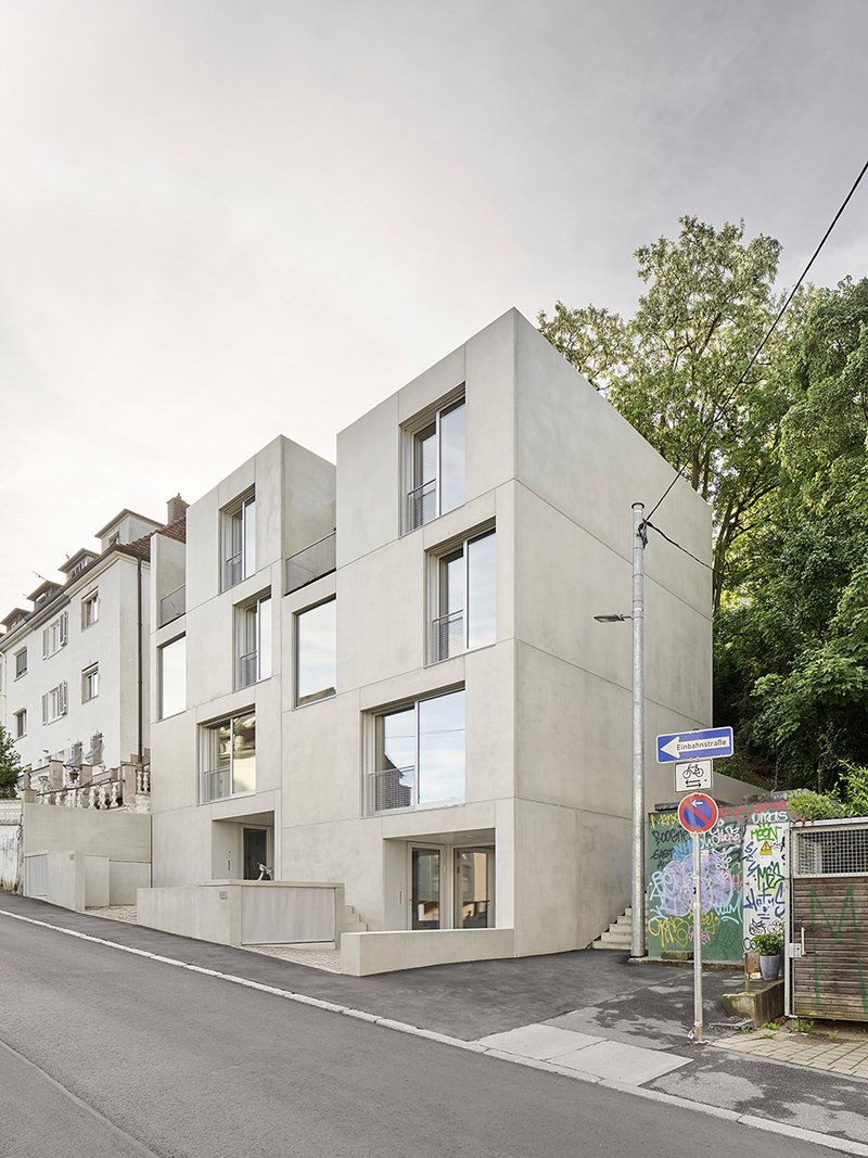 In Stuttgart Süd, an einem der Heslacher Hänge, hat das Büro VON M eines jener in der Stadt so selten werdenden, noch offenen Grundstücke gefunden. Wegen seiner Topographie, am nach Süden stark ansteigenden Hang, galt es lange als kaum zu bebauen. Die Architekt:innen haben hier zwei fast identische Häuser auf jeweils nahezu quadratischem Grundriss entwickelt. Dabei nimmt der Entwurf sowohl die Traufhöhe des östlichen Nachbarhauses wie auch dessen Gebäudetiefe als Maßstab gebendes Element mit auf. Da sich der Bau aufgrund der extremen Steigung des Grundstücks bis zu drei Geschosse in die Erde graben musste, stand schnell fest, dass ein Großteil des Hauses in Beton ausgeführt werden musste. Um Planungs- und Baukosten gering zu halten, entwarfen die Planer:innen einen Katalog aus einfachen Details und Fügungen mit Betonfertigteilen, die nun das gesamte Doppelhaus prägen.
