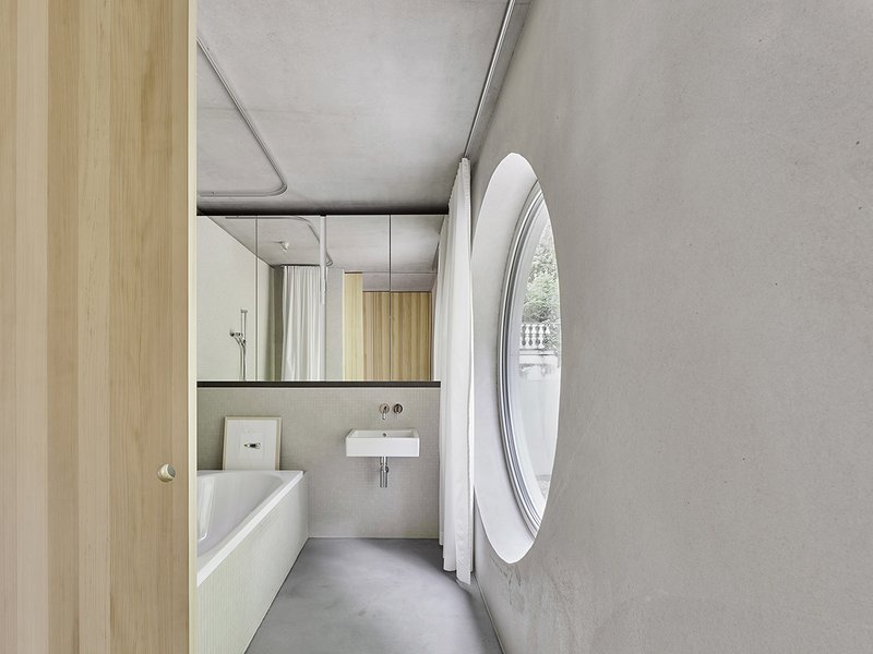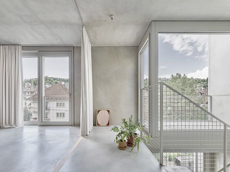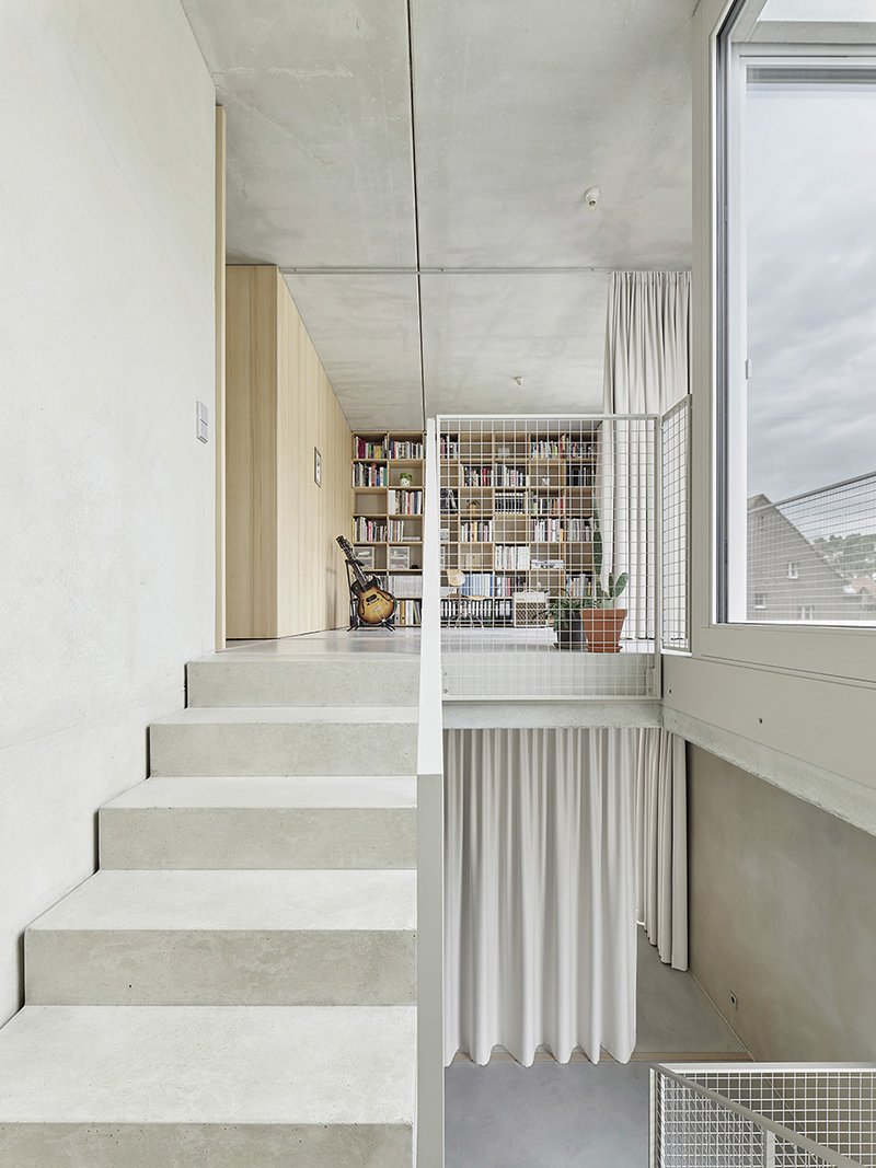 Einer logischen Folge hin zu mehr Privatheit folgend, entwickeln sich die Räume von der Öffentlichkeit der Straße ins Haus hinein und dort sukzessive nach oben. Wie eine räumliche Schwelle ist ein kleiner Vorplatz zwischen Straße und Haus eingefügt, die Terrasse, Auffahrt, Vorgarten und Mülltonneneinhausung gleichermaßen ist. Im Erdgeschoss befinden sich ein universell nutzbarer Raum, der sowohl Stellplatz für Zweiräder wie Arbeitsplatz oder Gästezimmer sein könnte, zwei hangseitige Abstellräume und ein Gäste-WC. Das Treppenhaus wird von einem fast haushohen Luftraum begleitet, der bei Bedarf später einmal mit einem Fahrstuhl nachgerüstet werden kann. Die Ästhetik des Äußeren wird hier ungebrochen fortgeschrieben: Beton und die schon bekannten industriellen Gitter für Brüstungen und Handläufe. Von hier gelangt man in einen offenen Wohnbereich im 1. Stock, der in Richtung der hangseitigen Küche durch eine Holzwand abgetrennt werden kann, momentan aber offen ist. So ist das gesamte Geschoss als durchlässiger Wohnraum samt Küche mit Essplatz, Couch und Sessel auf beiden Seiten mit Fenstern mit dem Außenraum verbunden. Zum Hang haben beide Häuser kleine Höfe, die sich mit ihren Einfriedungen als private Außenräume in den Hang graben und keine Blicke von außen zulassen. Auch das Geschoss darüber könnte als vollständige Fläche genutzt werden, ebenso gut aber ein, durch eine Wand räumlich gefasstes und ein, durch einen Vorhang optisch abgetrenntes Kompartiment ergeben – oder mit zwei klassischen Zimmern ausgeführt werden. Dazu kommt ein Bad, das im westlichen Zwilling mit einem großen runden Fenster ausgestattet ist, das wie eine augenzwinkernde Hommage an OMA´s Maison à Bordeaux wirkt. Das Dachgeschoss ist strukturell gleich aufgebaut: Hier ist der straßenseitige Raum derzeit als offenes Studiolo ausgeführt, ergänzt um ein Zimmer und ein weiteres Bad. Dazu kommt eine kleine Dachterrasse, von der der Blick weit über die Dächer Heslachs bis hinüber zum Hasenberg schweifen kann. Überhaupt, die Ausblicke: Immer wieder rahmen die großen, bodentiefen Fenster die Blicke ins Grün des Bergflanke oder hinaus auf die Stadt.