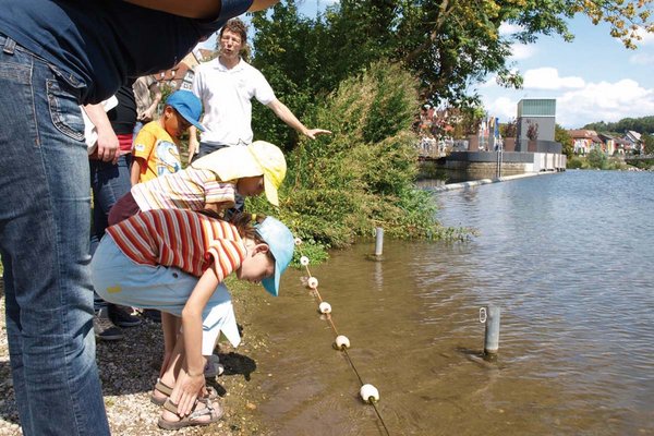 Der drei Kilometer lange Uferweg ist das Kernelement der Gartenschau, er verbindet auf idyllische Weise die sogenannten fünf Perlen. Das alte Freibadgelände im Westen markiert den Startpunkt. Entlang dem abwechslungsreichen Neckarufer führt der Weg über eine kleine Brücke zur Inselspitze. Bei der Besichtigung des neuen Flusswasserkraftwerks können neugierige Gemüter ihren Wissensdurst stillen. Eine weitere Perle ist die Neckarwiese mit Naturtribüne und Platanenallee auf dem Südufer, erreichbar über den Flößersteg. Ein Stück weiter östlich führt der von Linden flankierte Norduferweg am alten Marmorwerk vorbei. Die fünfte Perle ist der Bereich am Festplatz. Hier finden die Gartenschaubesucher zahlreiche Angebote von Verbänden und Vereinen, die Wassererlebniswelt sowie üppige Blütenpracht. So kann der Neckar mit allen Sinnen genossen werden – der Fluss wird wieder zum Stadtmittelpunkt.