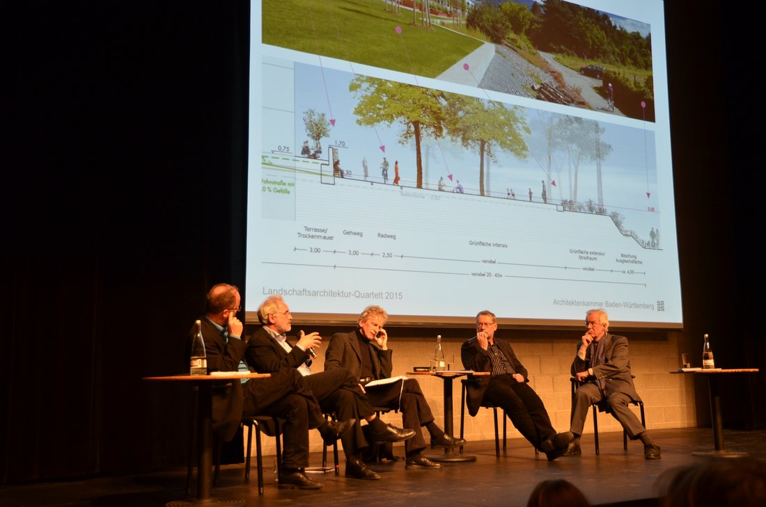 Den 240 Zuhörern, die sich aus Laien, kommunalen Vertretern und Landschaftsarchitekten zusammensetzten, stellte sich auf dem Podium eine lebendige Runde von Diskutanten aus unterschiedlichen Tätigkeitsfeldern: Prof. Michael Braum (Geschäftsführer der IBA Heidelberg), Tobias Mann (Landschaftsarchitekt aus Fulda), Prof. Dr. Dieter Jauch (ehemaliger Direktor der Wilhelma Stuttgart) und Robert Schäfer (bis Januar 2015 Chefredakteur der Zeitschriften Garten+ Landschaft und Topos). Moderiert wurde die Runde in bewährter Weise von Dr. Wolfgang Bachmann. Nach den Grußworten von Christof Luz (Vorstandsmitglied der Architektenkammer Baden-Württemberg) stellte Michael Glück (Mitglied des Arbeitskreises Landschaftsarchitektur) das erste Projekt vor: die Bahnstadt Heidelberg. Dort entsteht auf 116 Hektar ein neuer Stadtteil, in dem Wohnen, Arbeiten und Kultur miteinander verzahnt gelebt werden soll.