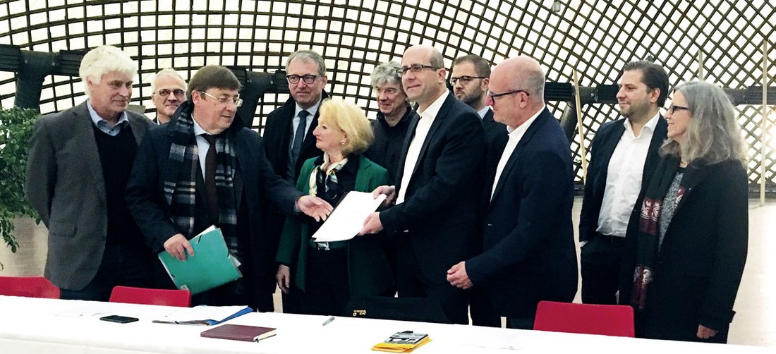 Nach der Unterzeichnung (v.l.) Wolfgang Raufelder † MdL; Bernhard Wondra, BDA; Lothar Quast, Baubürgermeister; Dr. Peter Kurz, Oberbürgermeister; Helen Heberer, Stadträtin; Dr. Wolfgang Naumer, BDB; Steffen Ratzel, Stadtrat; Benjamin Laber, Leiter Rechnungsamt, Stadt Mannheim; Stephan Weber, Vizepräsident der AKBW; Prof. Dr. Georg Vrachliotis, SAAI; Karin M. Storch, Vorsitzendeder Kammergruppe Mannheim