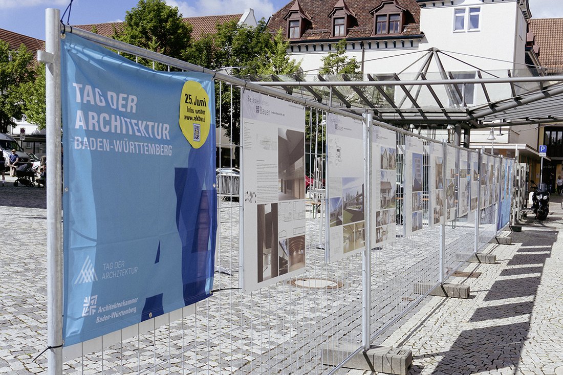 Erneut zum Einsatz kamen auch in Biberach an der Riß die bereits 2021 als Bauzaun-Ausstellung produzierten Aufstelltafeln zu öffentlichen Räumen. Sie stießen – ergänzt um die Ausstellung zum Beispielhaften Bauen im Landkreis – auf großes Interesse der Passanten. Die Besichtigungstouren, unter anderem zum sanierten Rathaus und zum Stadtarchiv, lockten zusätzlich 40 Architekturinteressierte an.
